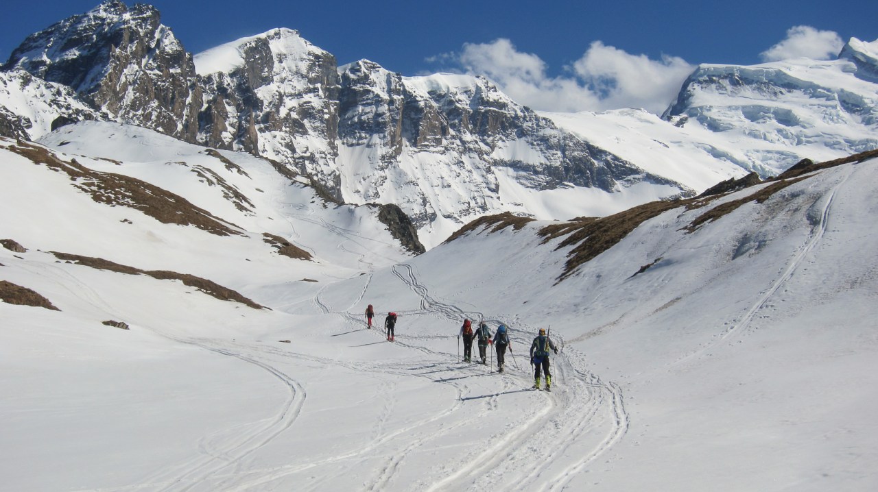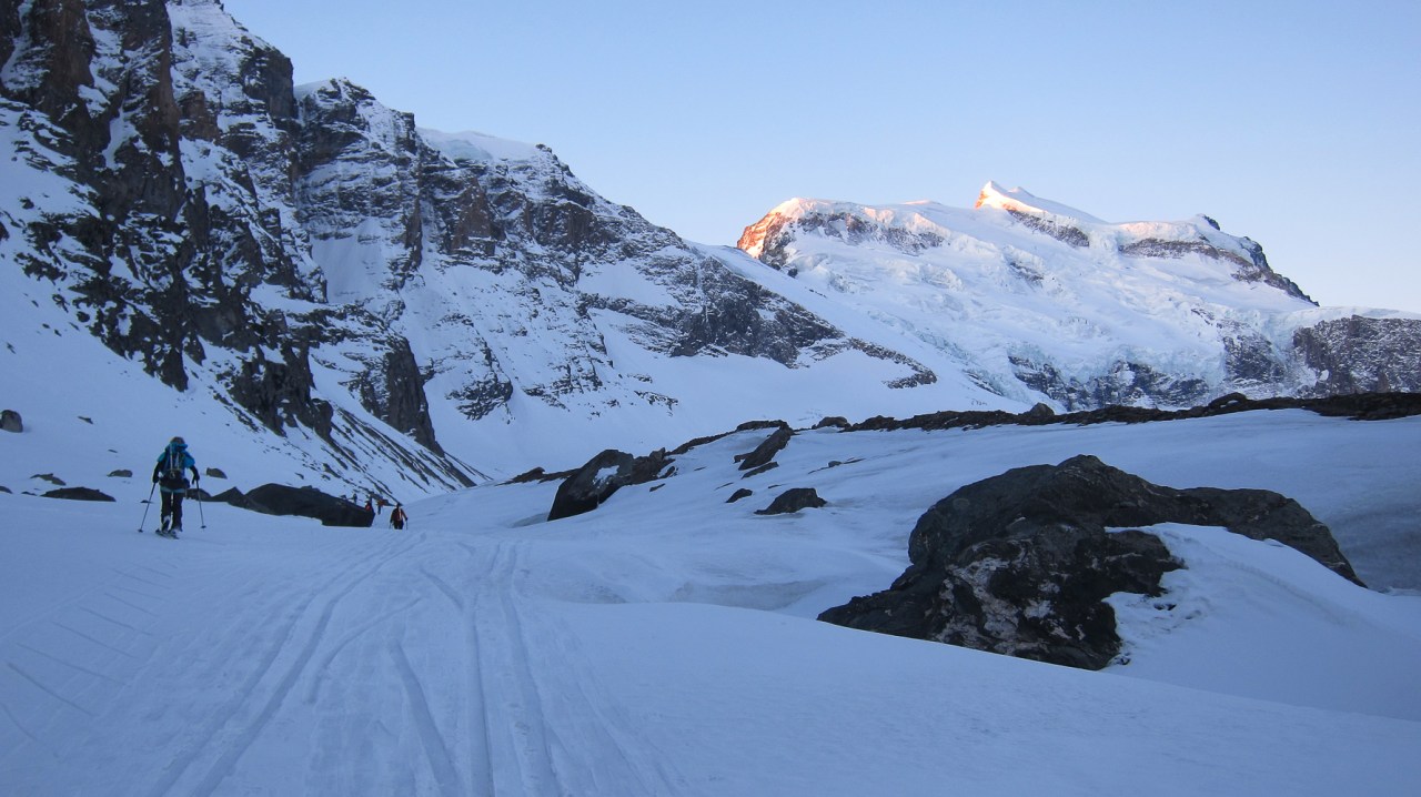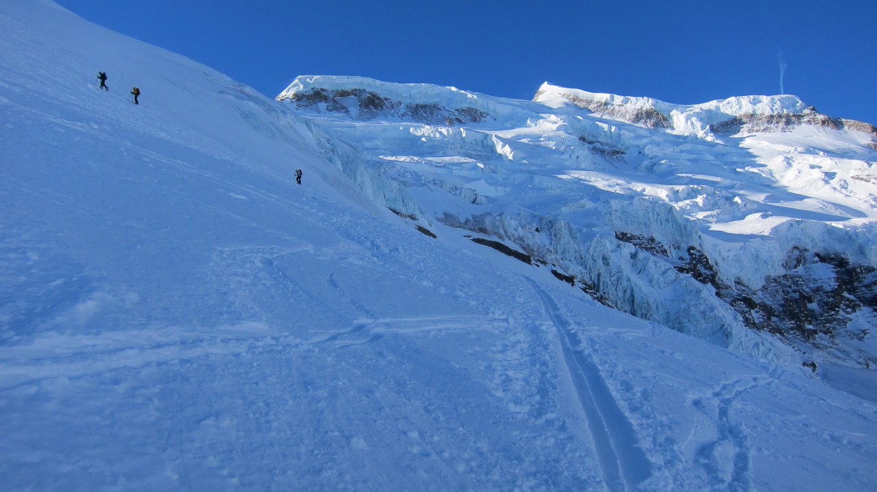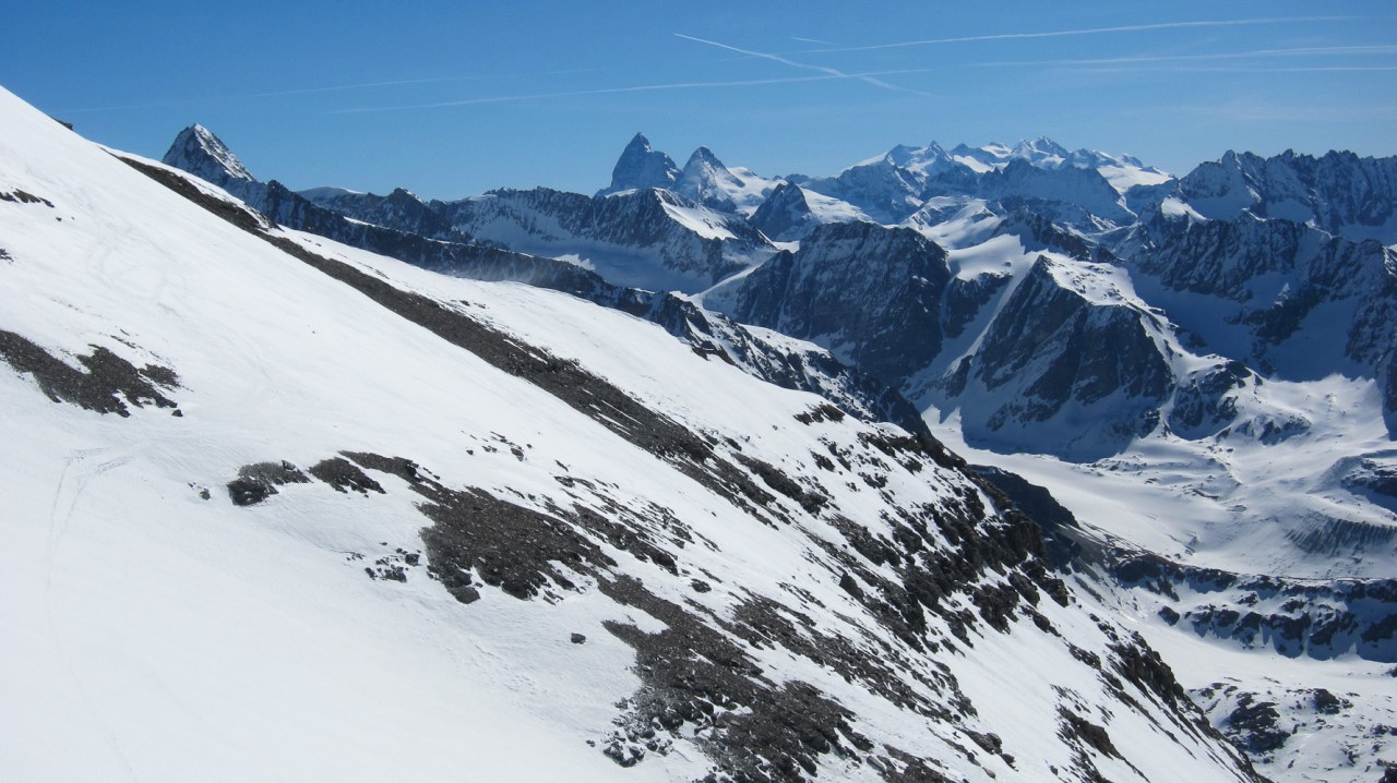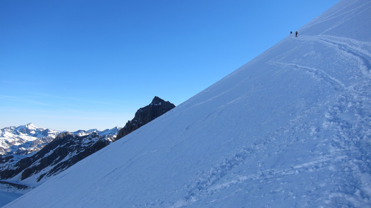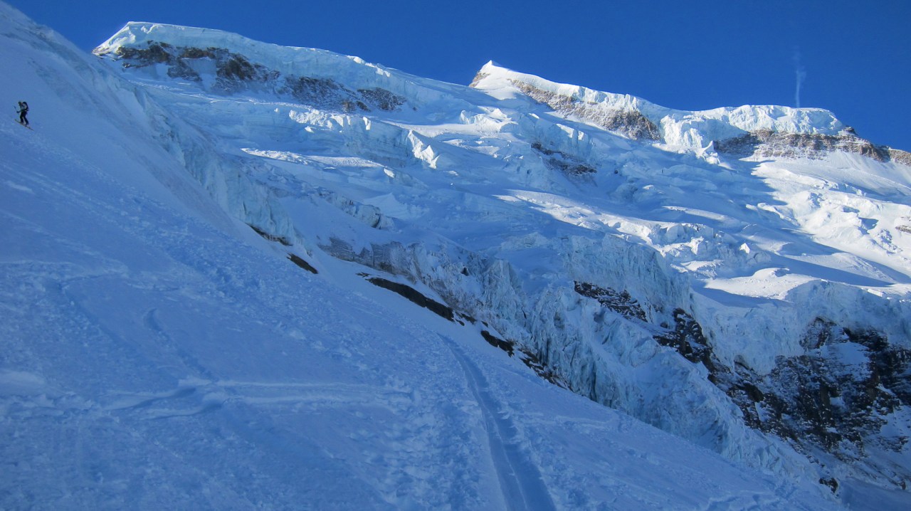 C’est encore avec plaisir qu’on remontera à la cabane de Pannossière pour aller visiter ce vaste secteur. On remontera alors les grandes pentes du Tournelon Blanc, à main gauche du Grand Combin. La pente forte qui mène au col du même nom promet une belle descente soutenue à condition qu’elle ne soit pas trop chargée.