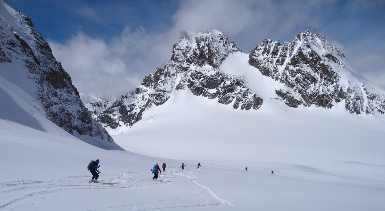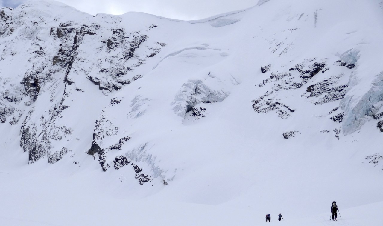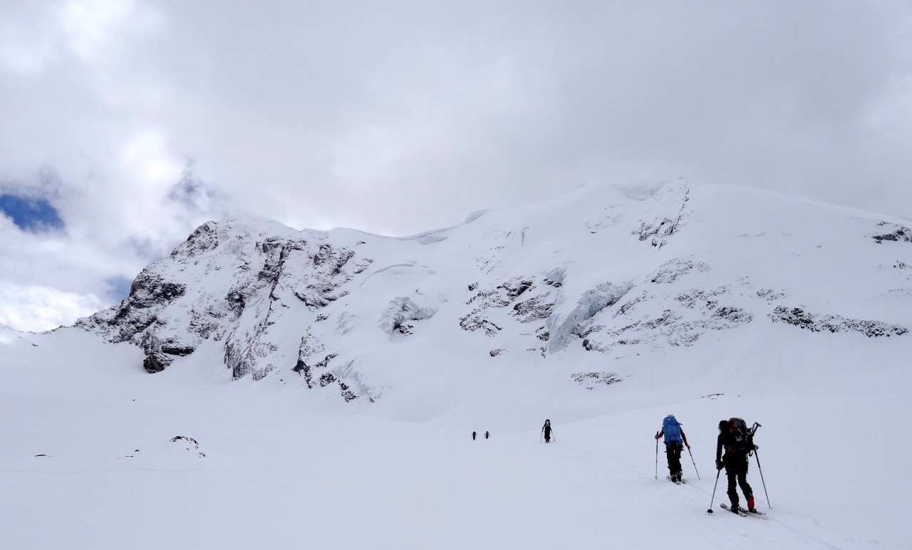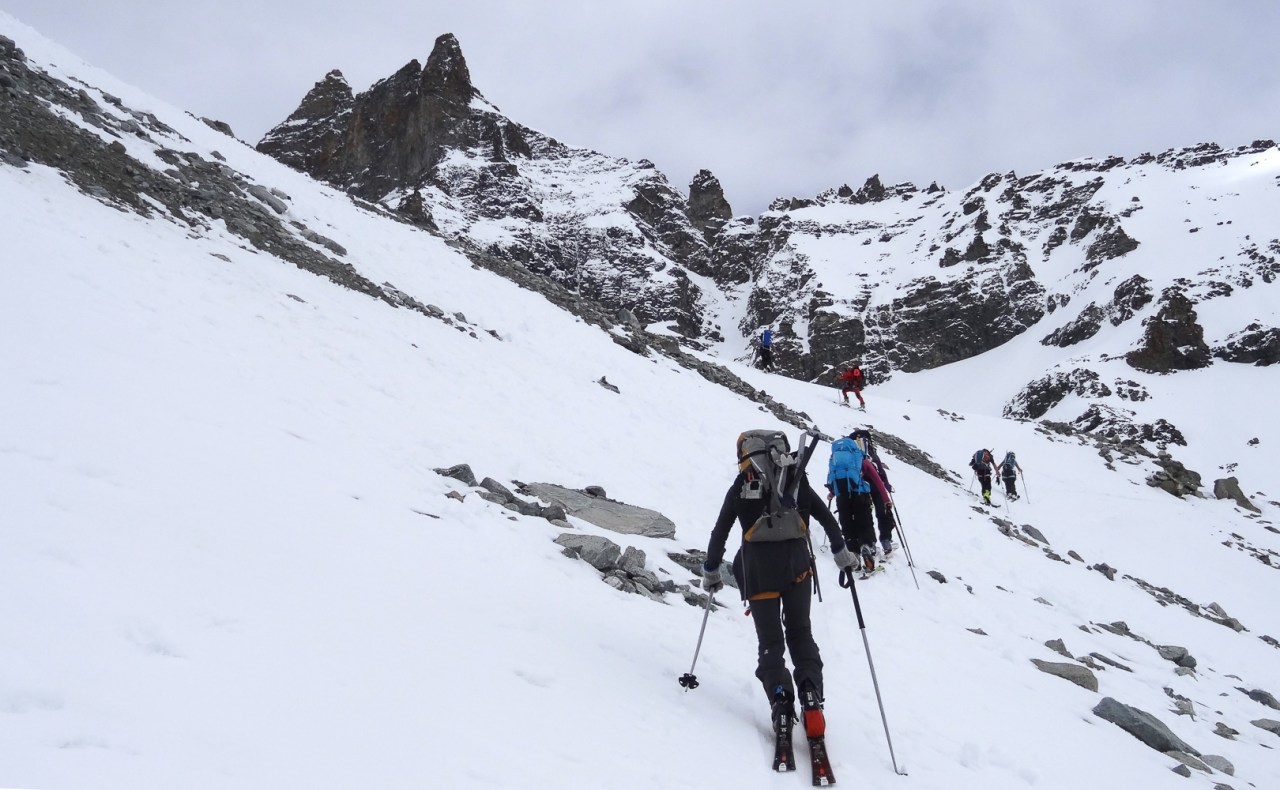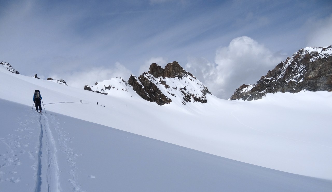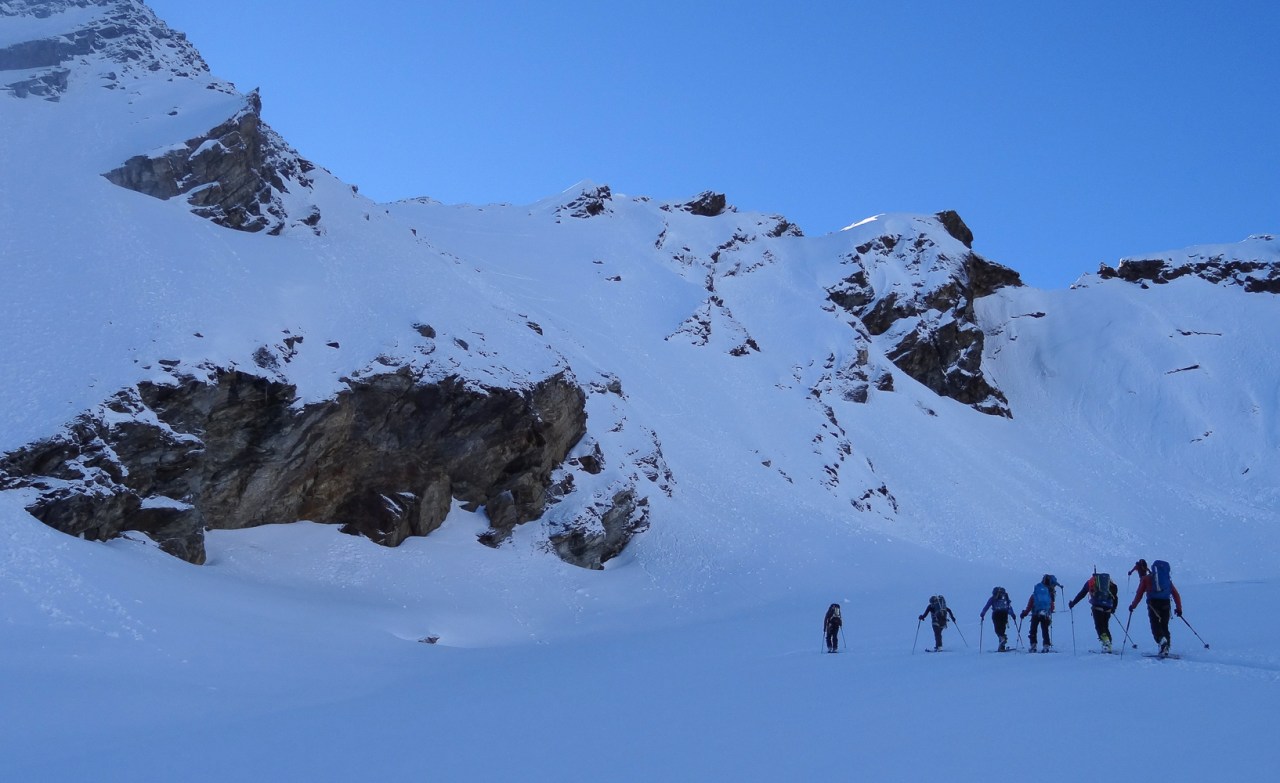 C’est toujours avec beaucoup de plaisir qu’on chausse les skis à Arolla pour monter passer la nuit au refuge des Bouquetins, se faire une bonne soirée entre copains et copines, et démarrer le lendemain pour un beau parcours sur les glaciers, avec la vue imprenable du Cervin depuis le col de Valpelline.