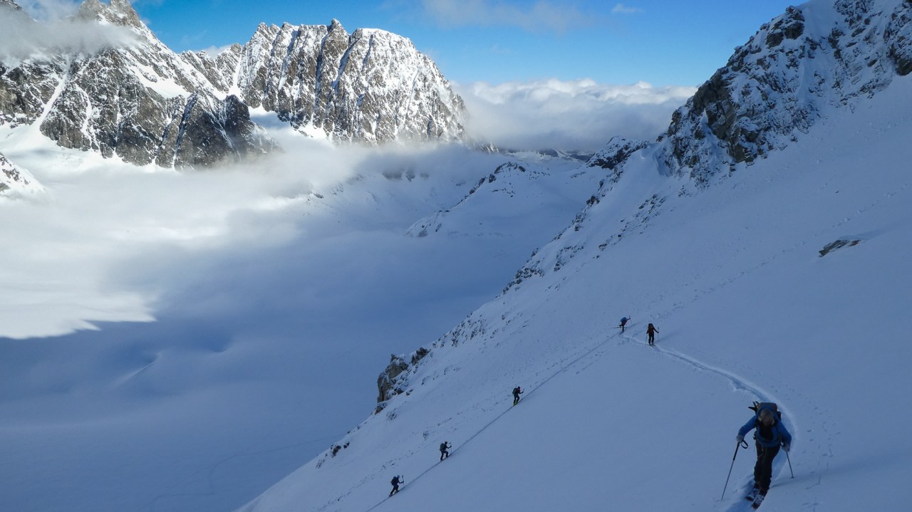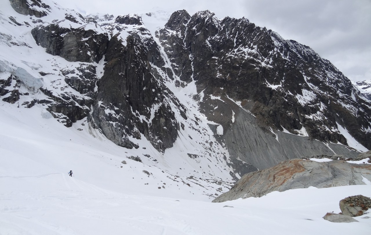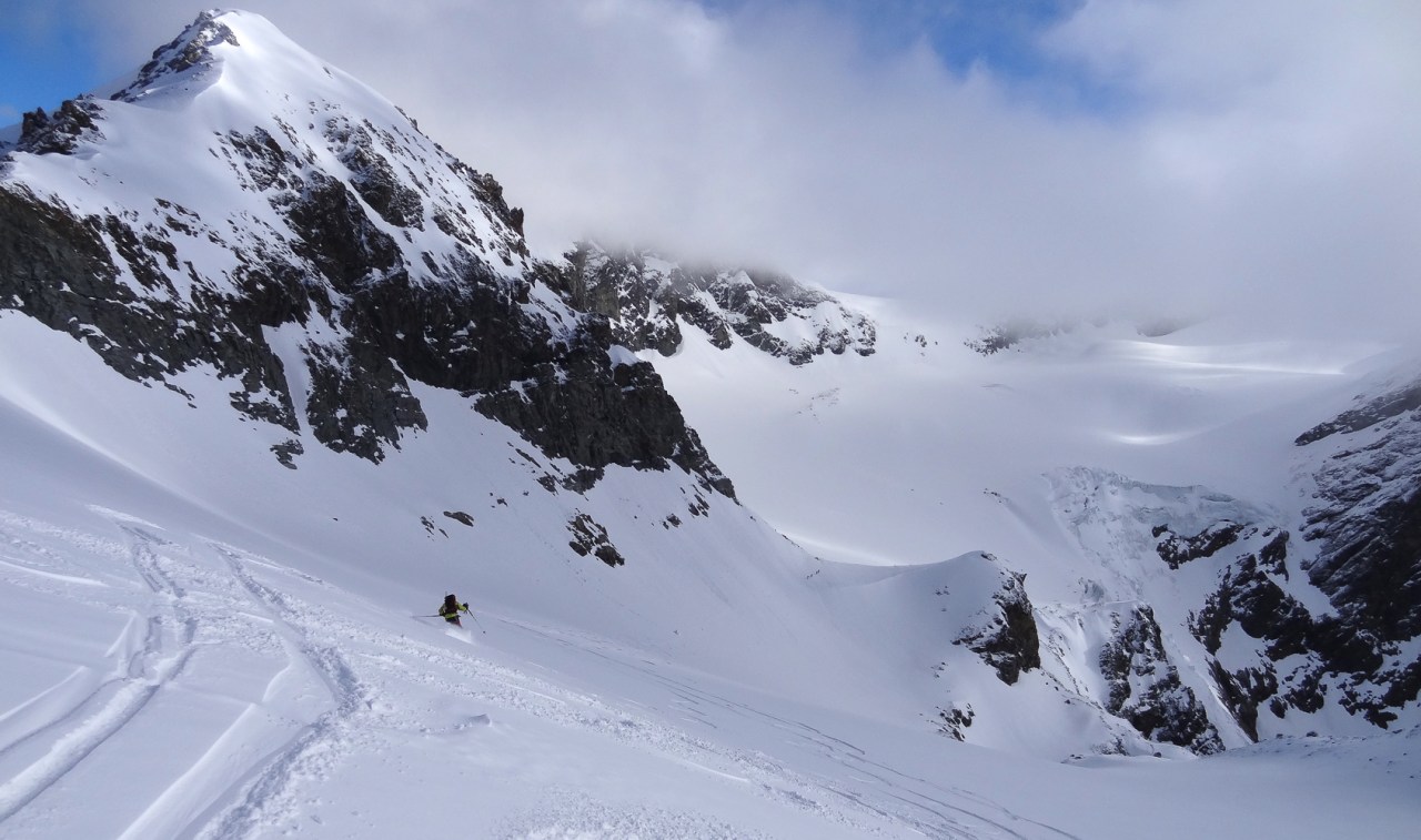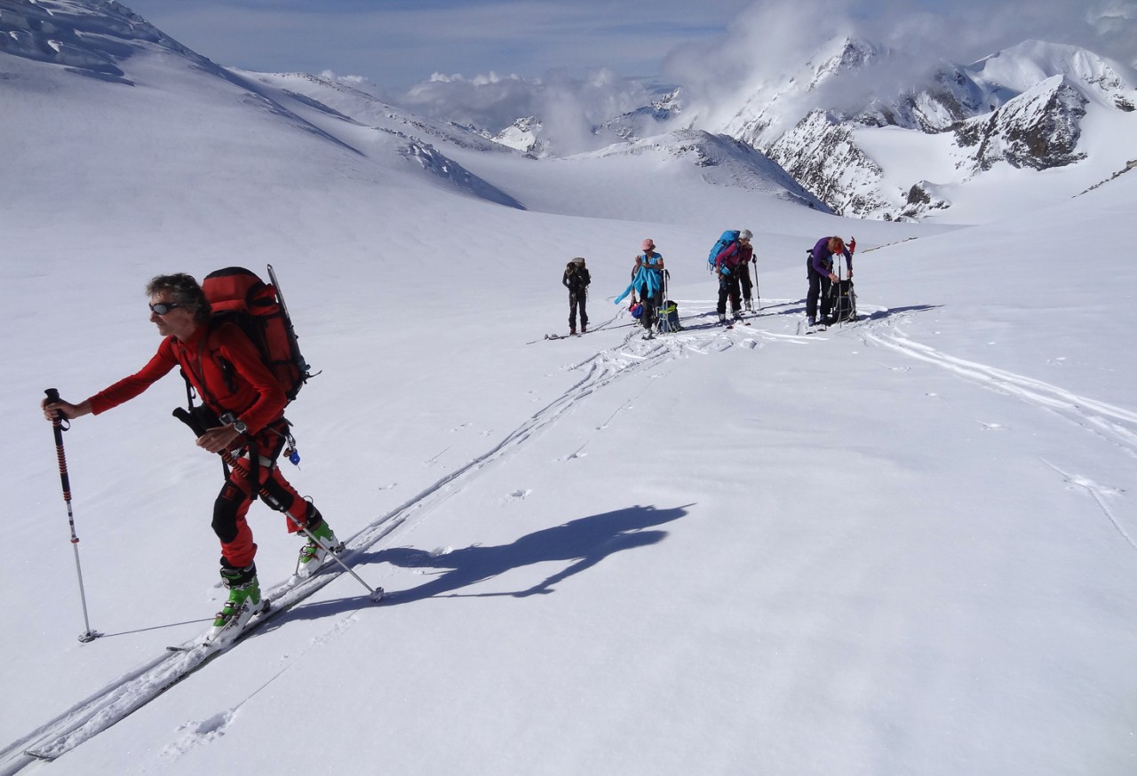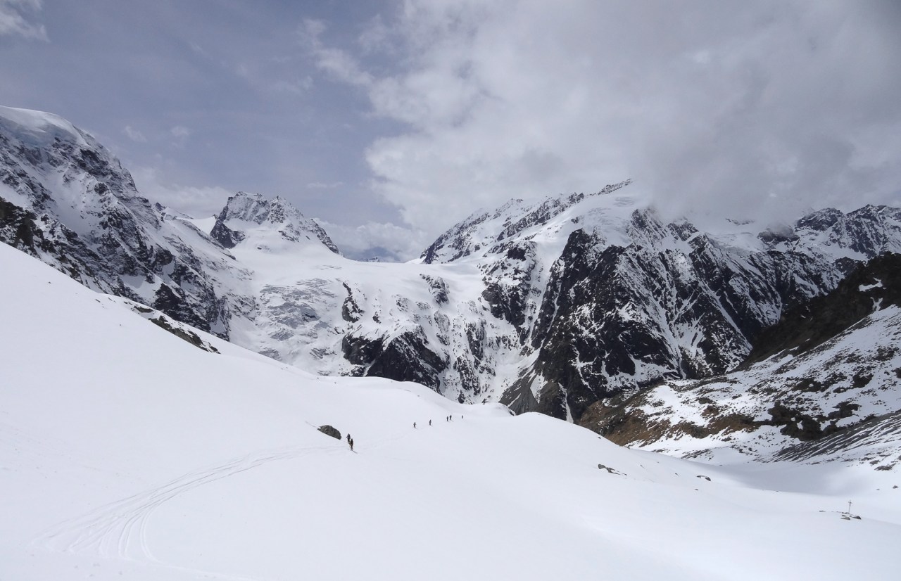 C’est toujours avec beaucoup de plaisir qu’on chausse les skis à Arolla pour monter passer la nuit au refuge des Bouquetins, se faire une bonne soirée entre copains et copines, et démarrer le lendemain pour un beau parcours sur les glaciers, avec la vue imprenable du Cervin depuis le col de Valpelline.