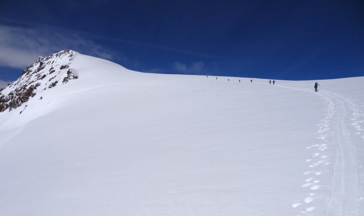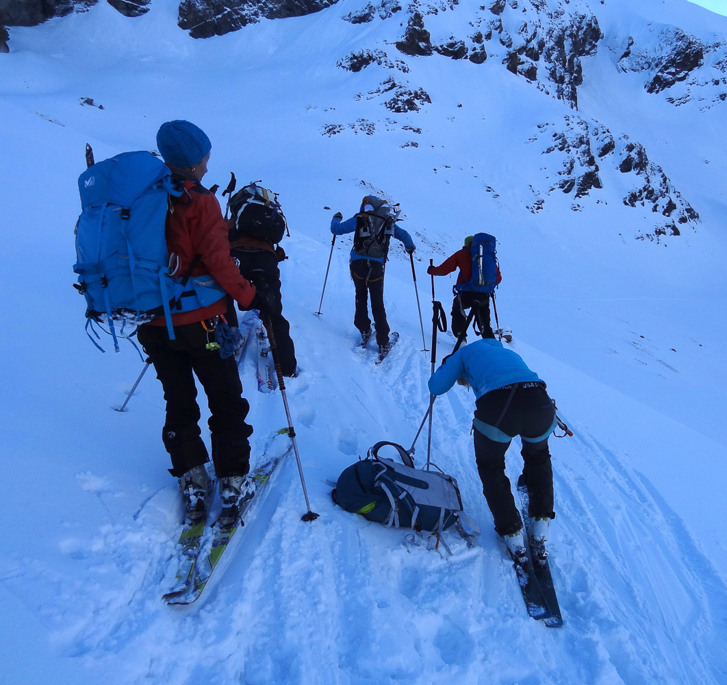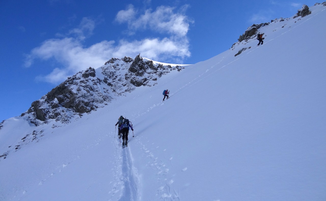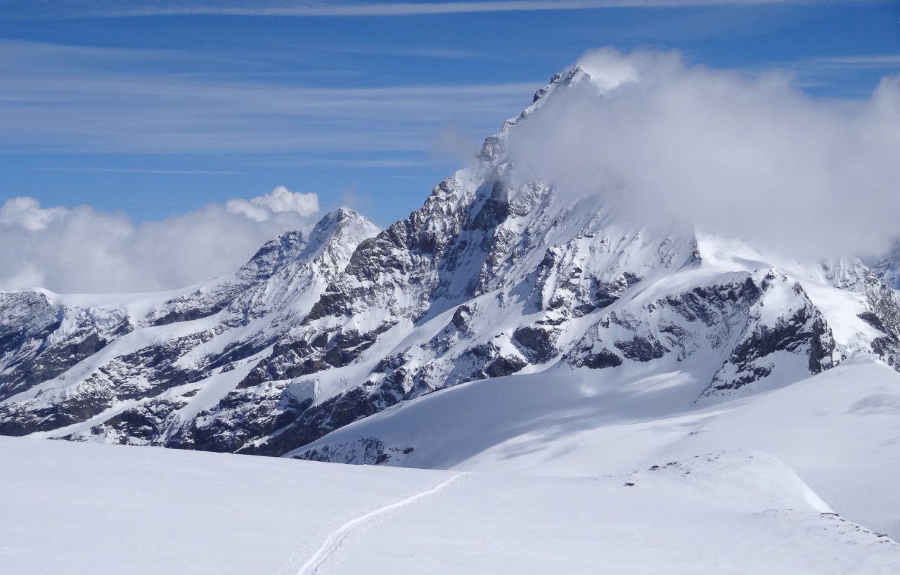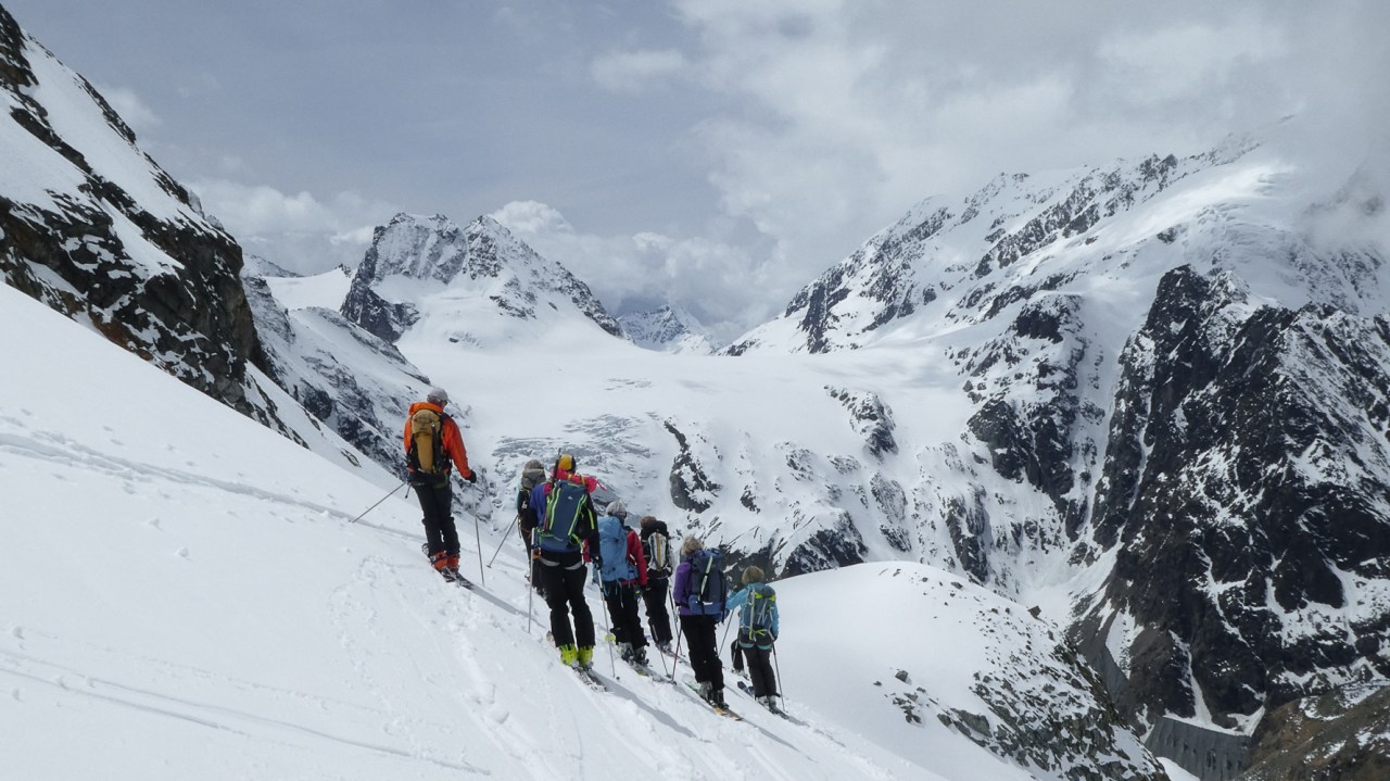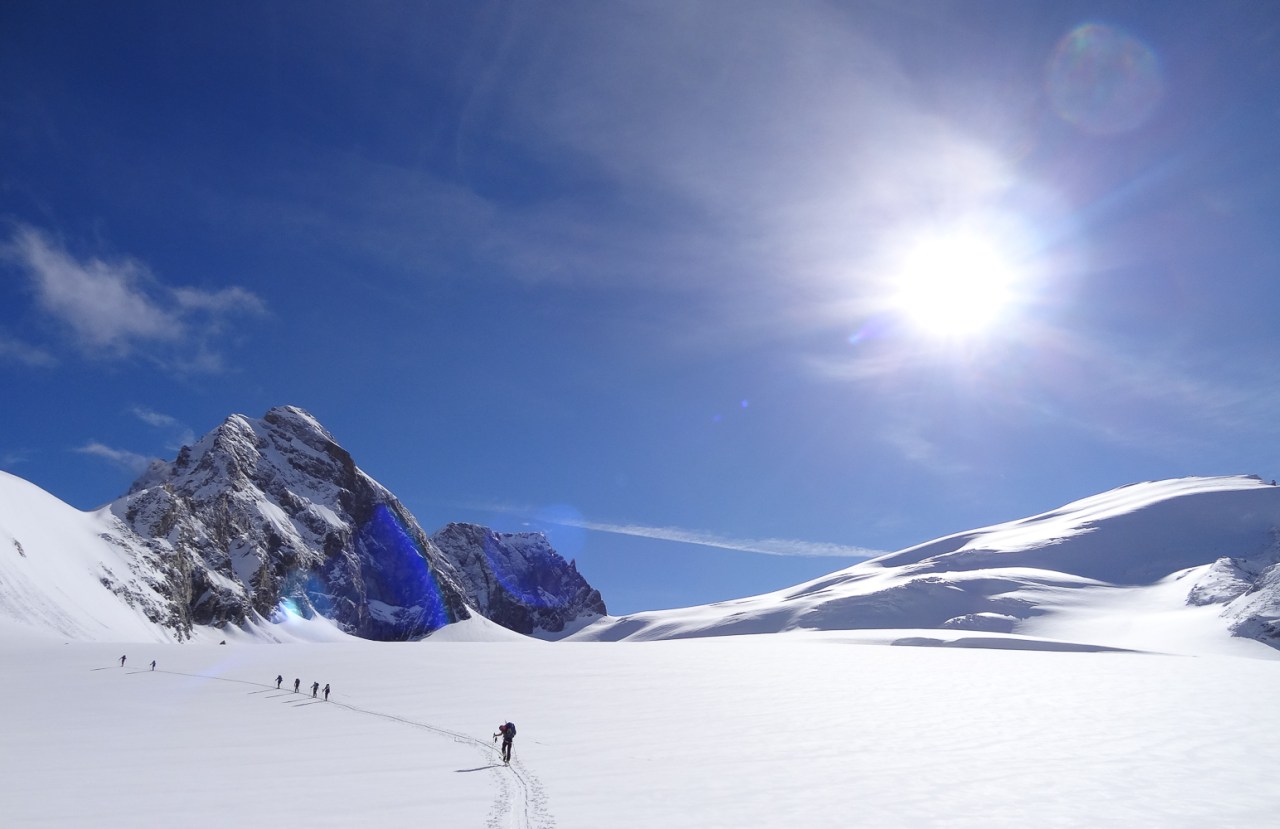 C’est toujours avec beaucoup de plaisir qu’on chausse les skis à Arolla pour monter passer la nuit au refuge des Bouquetins, se faire une bonne soirée entre copains et copines, et démarrer le lendemain pour un beau parcours sur les glaciers, avec la vue imprenable du Cervin depuis le col de Valpelline.