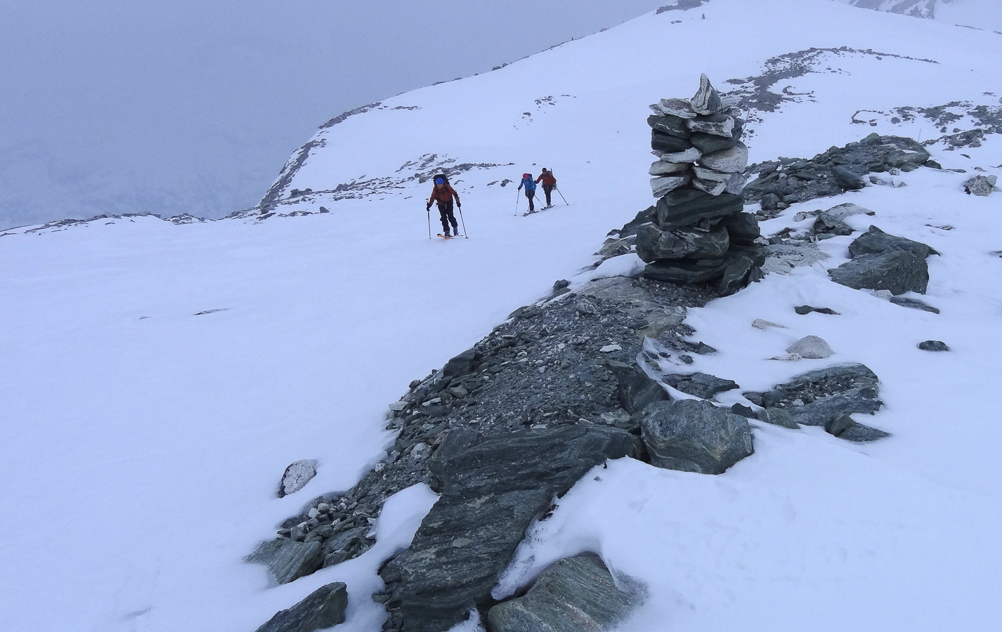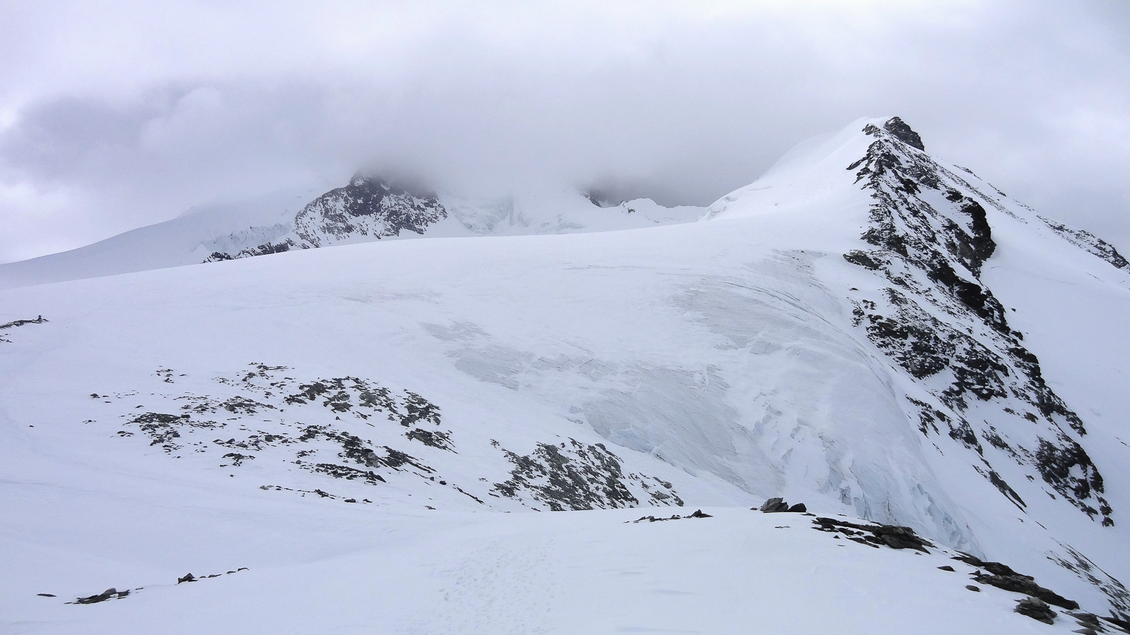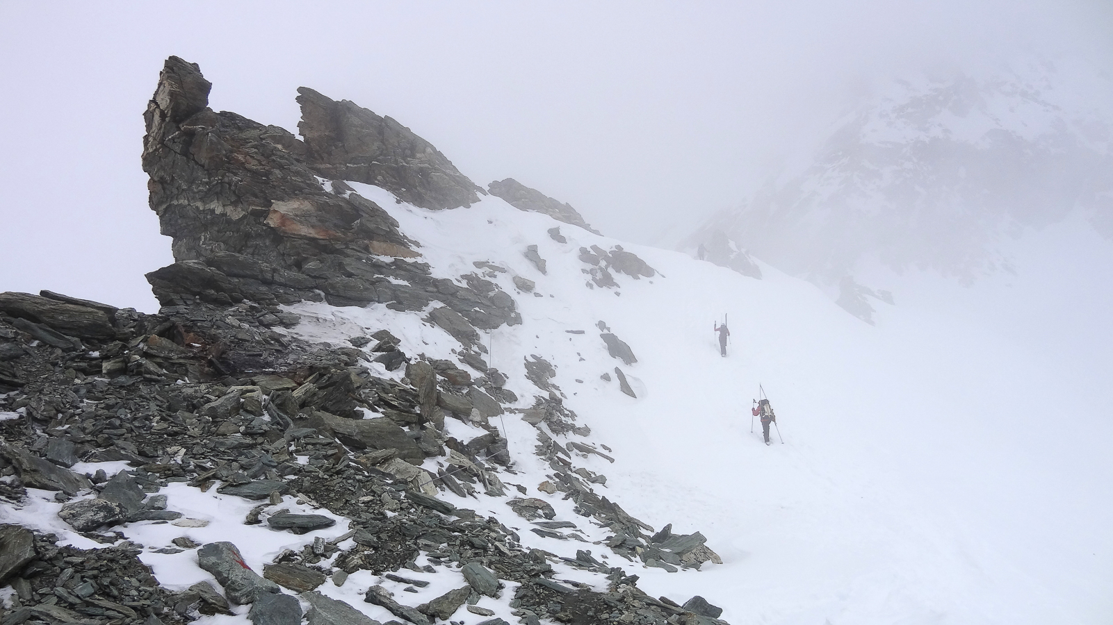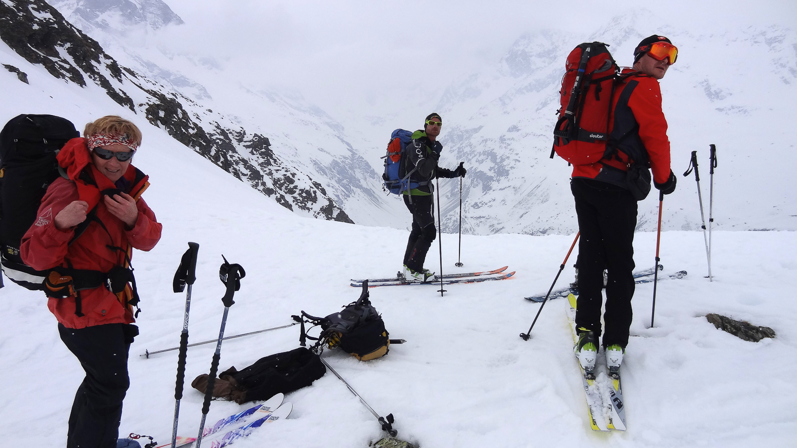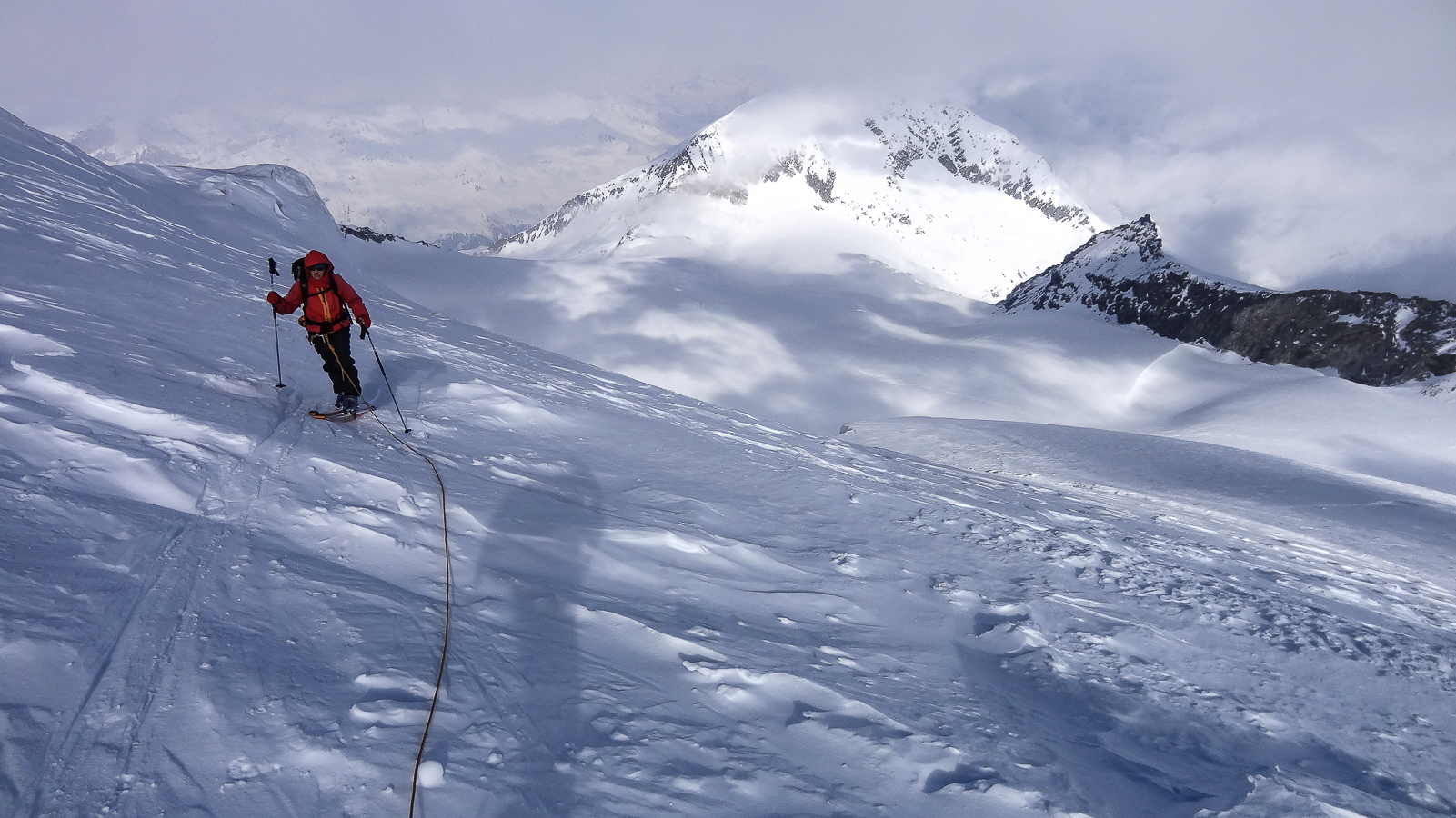 Le lever du jour incertain nous voit remonter les grandes pentes régulières du Bishorn , bien secoués que nous sommes par les rafales. Le plafond nuageux s’abaisse sur nous et il faut sortir les cordes, enfiler une couche supplémentaire et bien fermer les ouvertures. Contrairement à certaines années, le terrain est miné par les crevasses . Enfin, arrivés au col, ça tabasse vraiment trop et on n’en verra pas plus. Donc…c’est demi-tour et GPS au poing pour retrouver exactement la bonne trace, car tout a été effacé. Premiers 4000 à skis pour ma fille Lisa et Fred . On a fêté ça dignement au refuge à la descente !