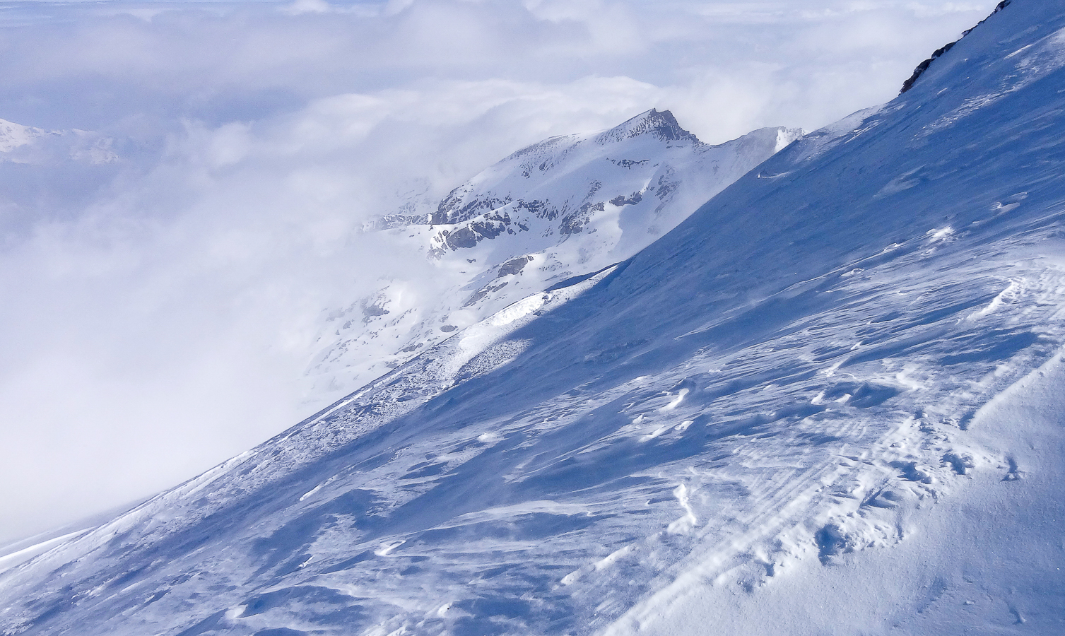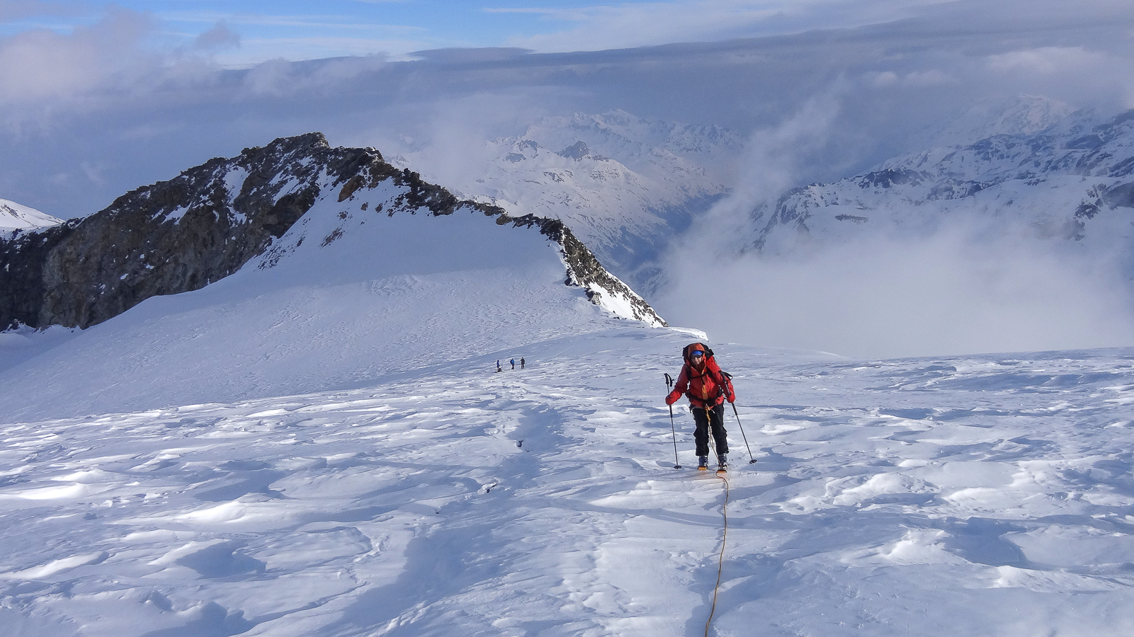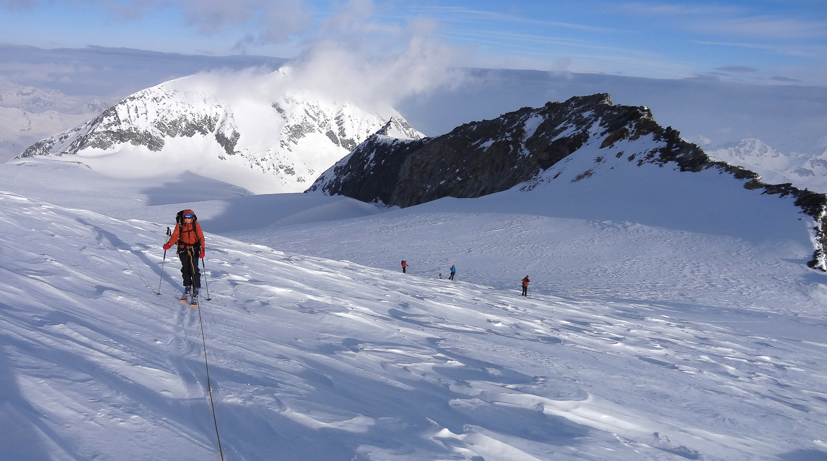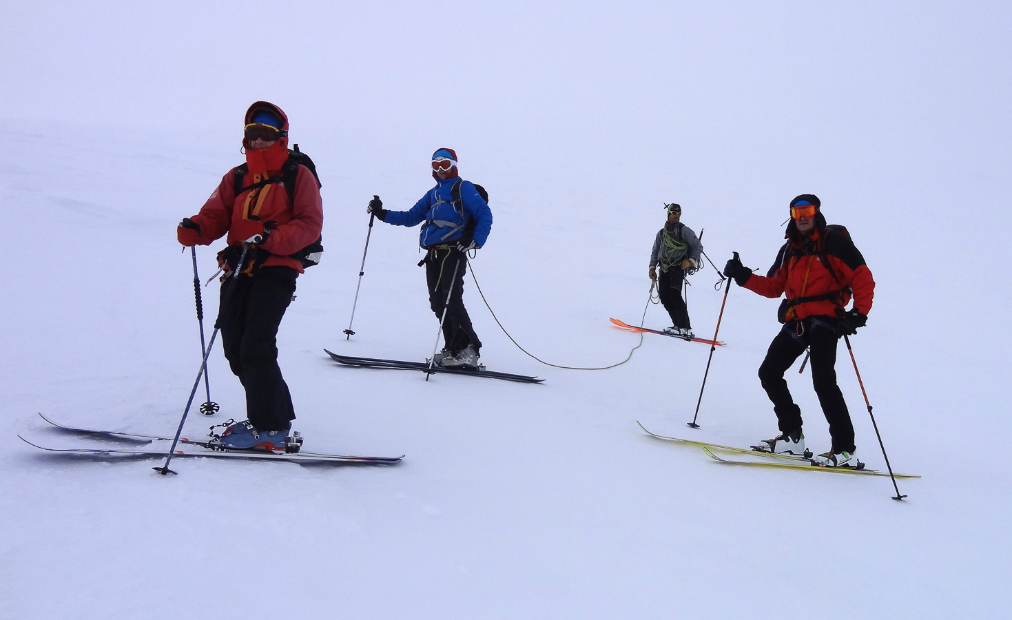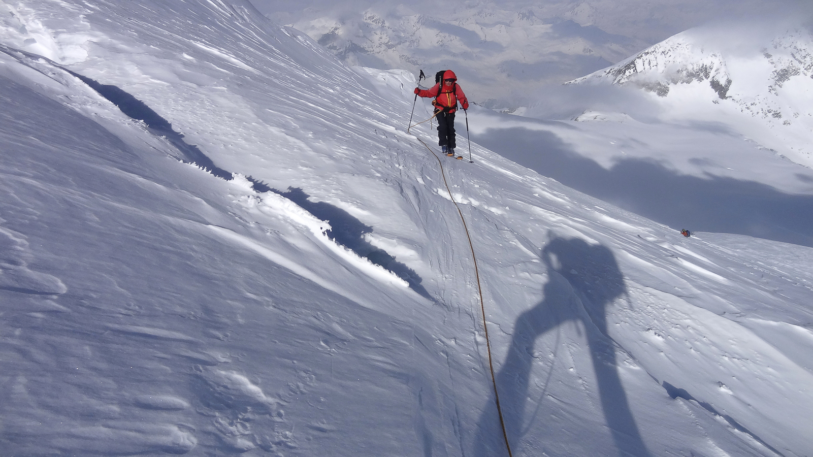 Le lever du jour incertain nous voit remonter les grandes pentes régulières du Bishorn , bien secoués que nous sommes par les rafales. Le plafond nuageux s’abaisse sur nous et il faut sortir les cordes, enfiler une couche supplémentaire et bien fermer les ouvertures. Contrairement à certaines années, le terrain est miné par les crevasses . Enfin, arrivés au col, ça tabasse vraiment trop et on n’en verra pas plus. Donc…c’est demi-tour et GPS au poing pour retrouver exactement la bonne trace, car tout a été effacé. Premiers 4000 à skis pour ma fille Lisa et Fred . On a fêté ça dignement au refuge à la descente !