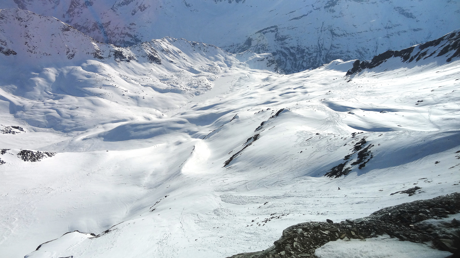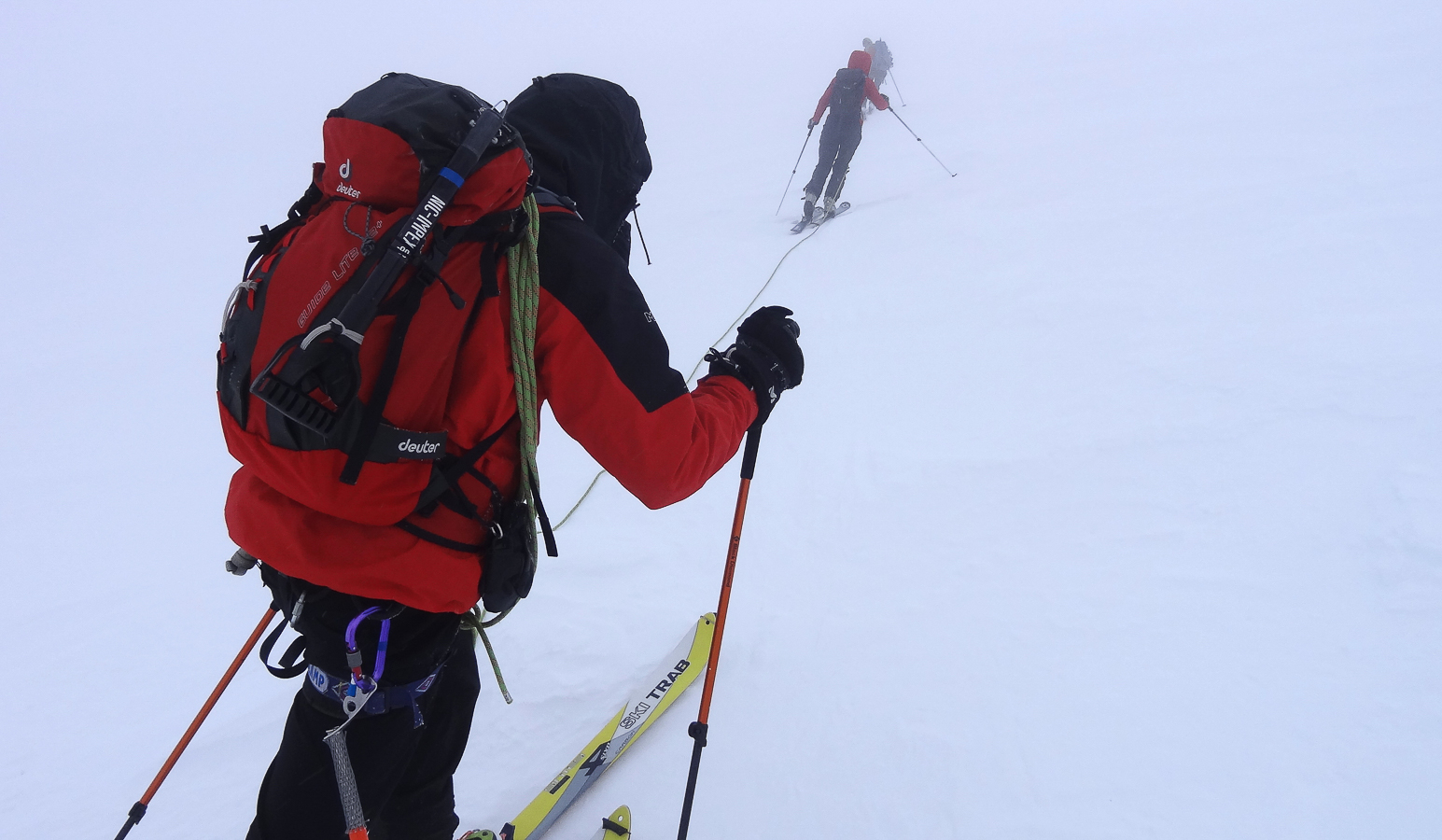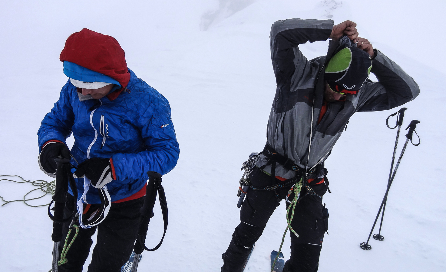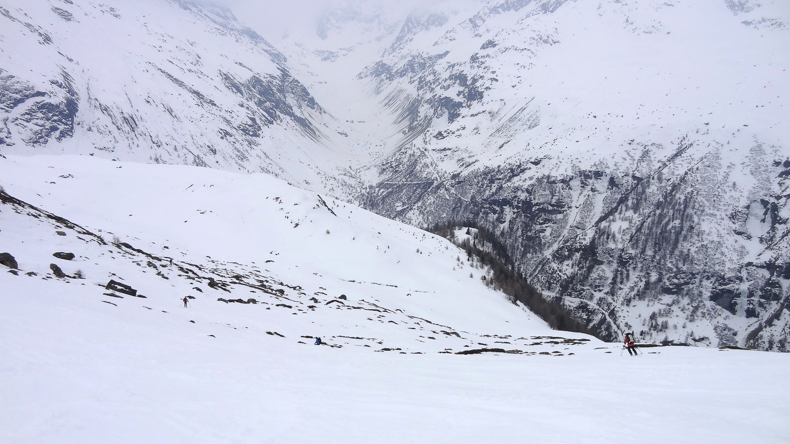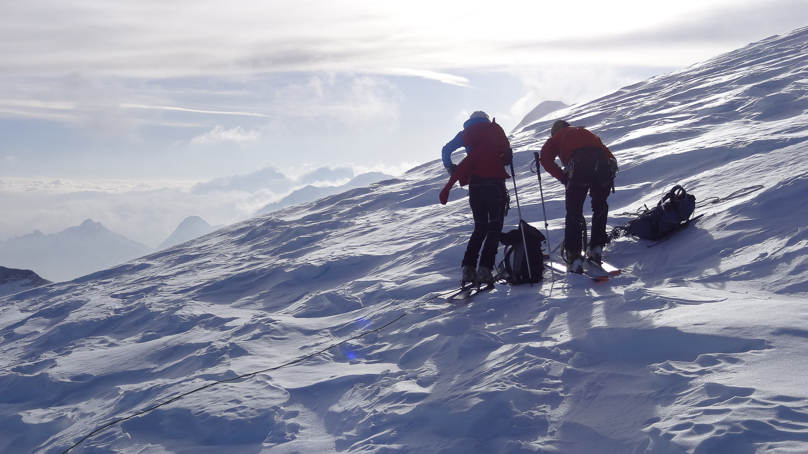 Le lever du jour incertain nous voit remonter les grandes pentes régulières du Bishorn , bien secoués que nous sommes par les rafales. Le plafond nuageux s’abaisse sur nous et il faut sortir les cordes, enfiler une couche supplémentaire et bien fermer les ouvertures. Contrairement à certaines années, le terrain est miné par les crevasses . Enfin, arrivés au col, ça tabasse vraiment trop et on n’en verra pas plus. Donc…c’est demi-tour et GPS au poing pour retrouver exactement la bonne trace, car tout a été effacé. Premiers 4000 à skis pour ma fille Lisa et Fred . On a fêté ça dignement au refuge à la descente !