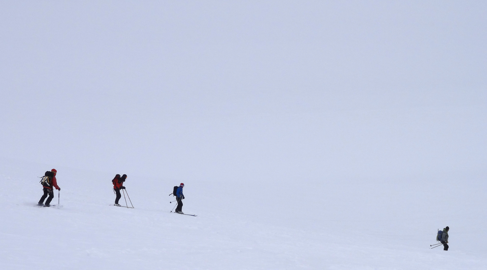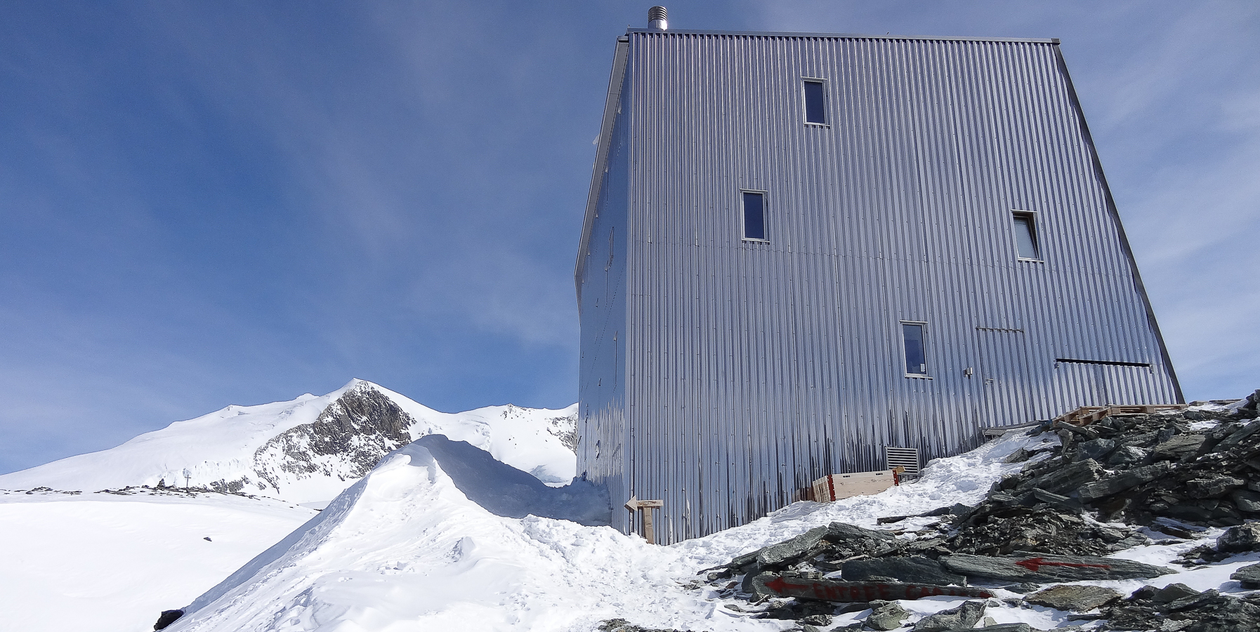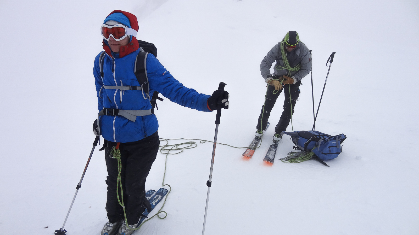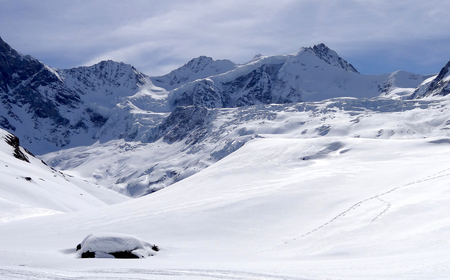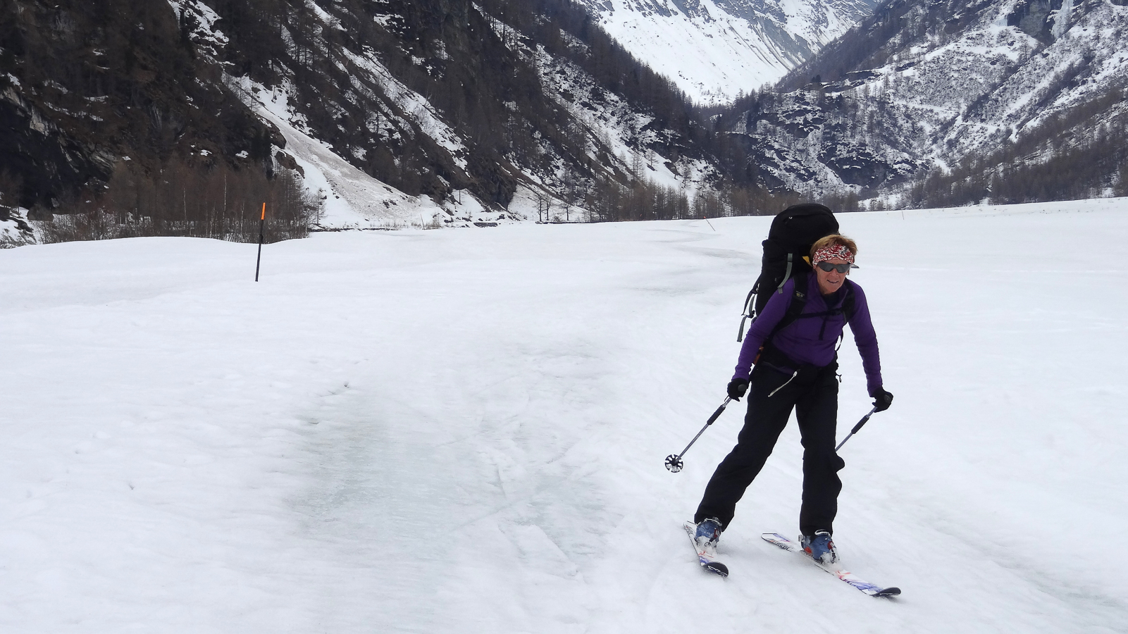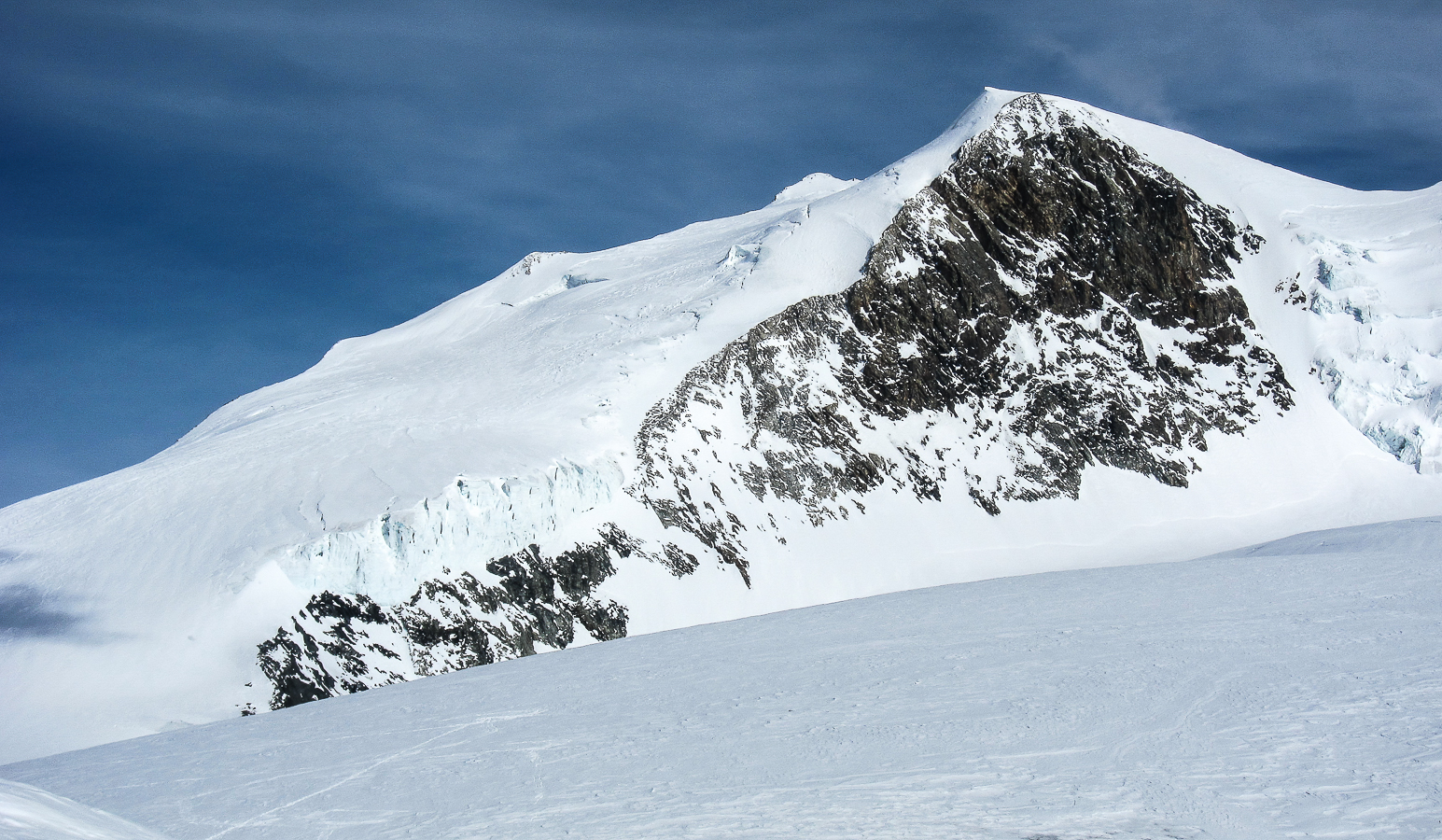 Le lever du jour incertain nous voit remonter les grandes pentes régulières du Bishorn , bien secoués que nous sommes par les rafales. Le plafond nuageux s’abaisse sur nous et il faut sortir les cordes, enfiler une couche supplémentaire et bien fermer les ouvertures. Contrairement à certaines années, le terrain est miné par les crevasses . Enfin, arrivés au col, ça tabasse vraiment trop et on n’en verra pas plus. Donc…c’est demi-tour et GPS au poing pour retrouver exactement la bonne trace, car tout a été effacé. Premiers 4000 à skis pour ma fille Lisa et Fred . On a fêté ça dignement au refuge à la descente !