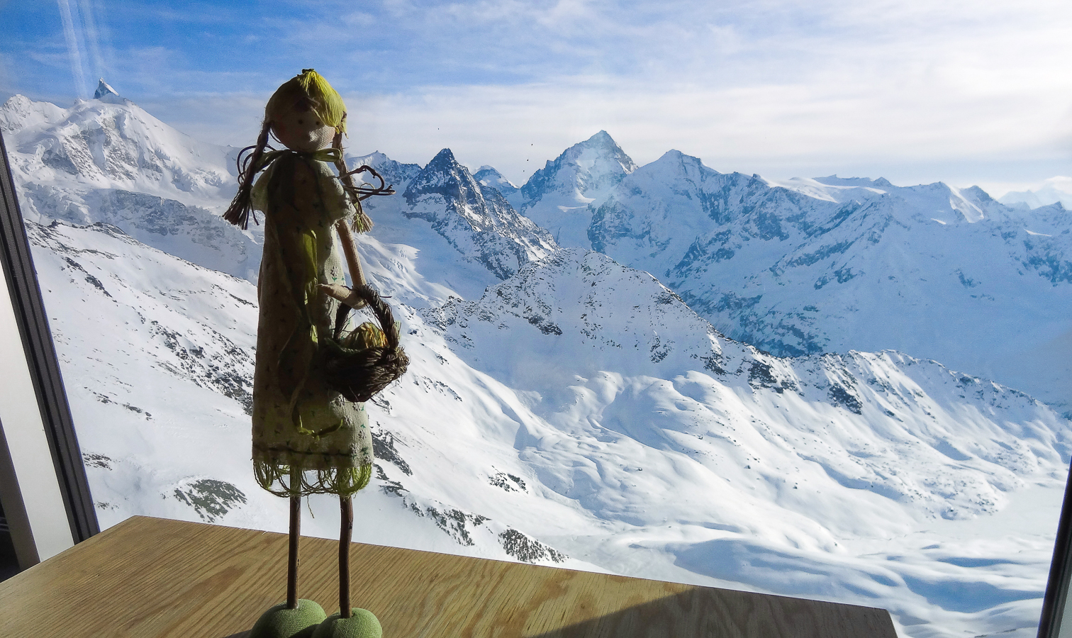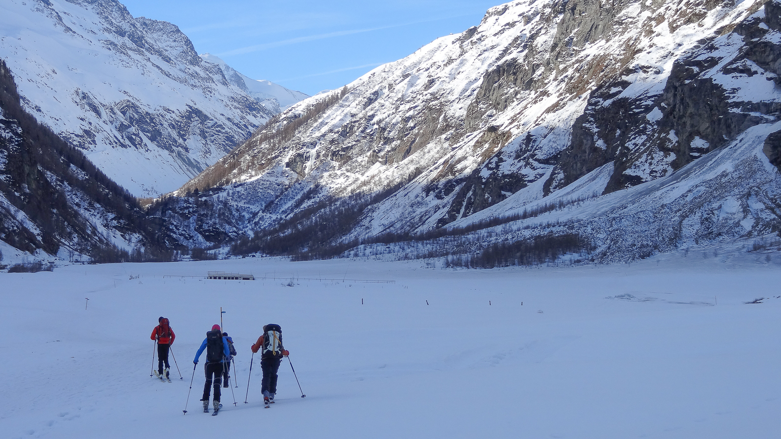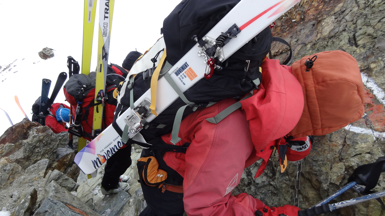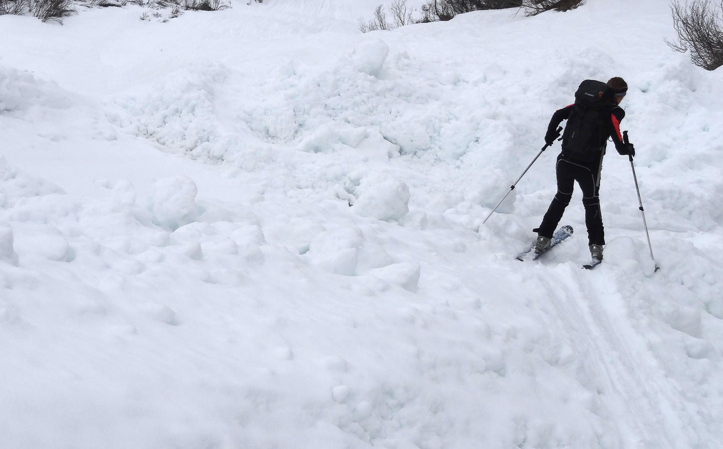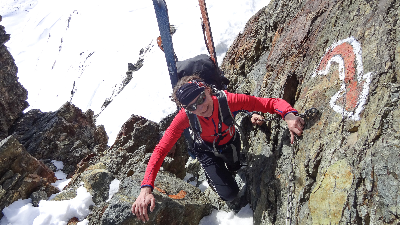 Le lever du jour incertain nous voit remonter les grandes pentes régulières du Bishorn , bien secoués que nous sommes par les rafales. Le plafond nuageux s’abaisse sur nous et il faut sortir les cordes, enfiler une couche supplémentaire et bien fermer les ouvertures. Contrairement à certaines années, le terrain est miné par les crevasses . Enfin, arrivés au col, ça tabasse vraiment trop et on n’en verra pas plus. Donc…c’est demi-tour et GPS au poing pour retrouver exactement la bonne trace, car tout a été effacé. Premiers 4000 à skis pour ma fille Lisa et Fred . On a fêté ça dignement au refuge à la descente !