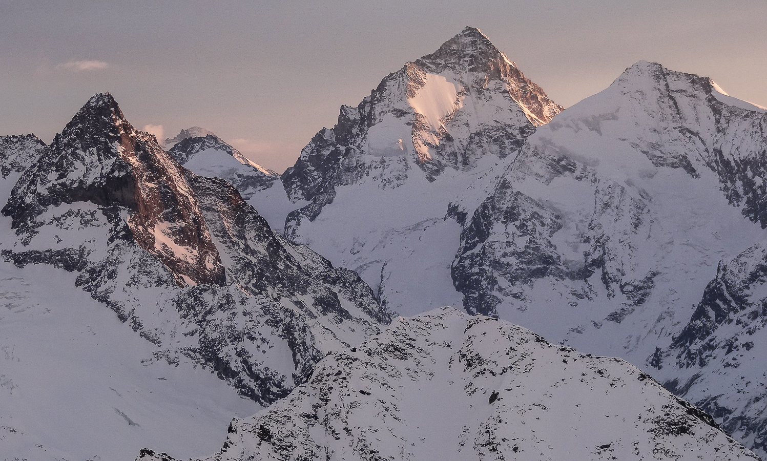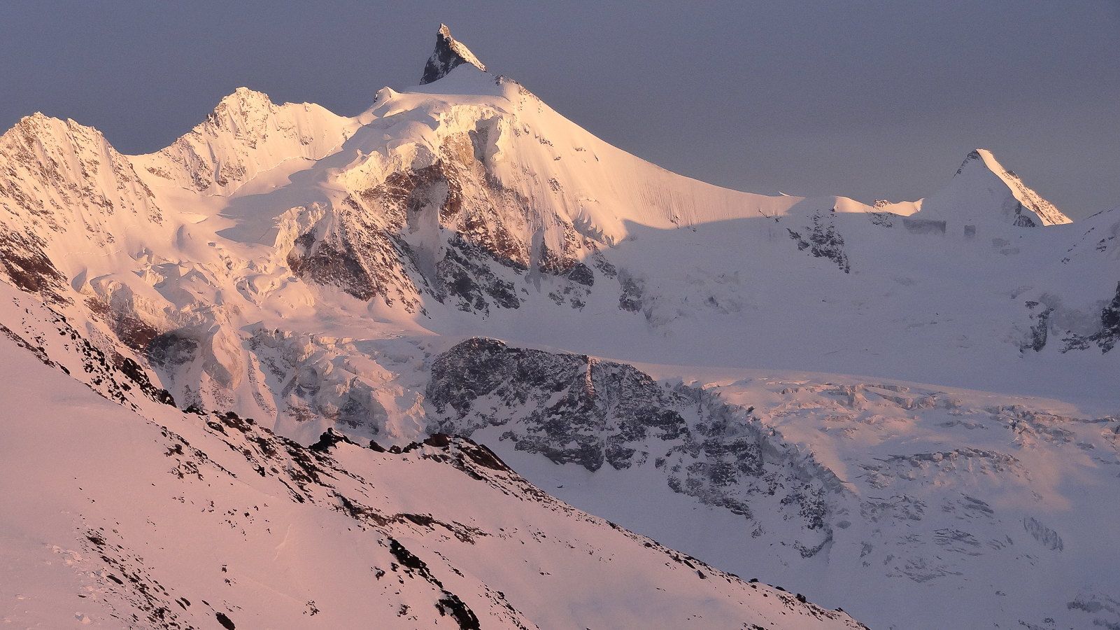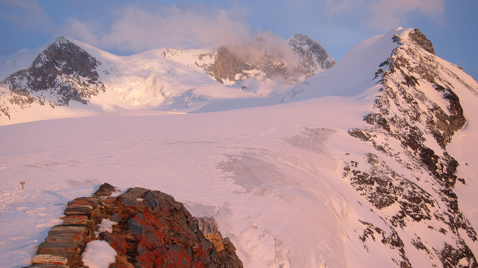 La photographie ci-dessous ne nous montre pas le Bishorn. Mais le Weisshorn, que nous aurions dû admirer si le temps nous avait été favorable. Mais que diable ! La montée seule au refuge de Tracuit nous apporte son lot habituel de satisfactions . La marche est longue, éprouvante lorsqu’il fait très chaud et qu’il faut remonter les grandes pentes en plein sud. Le spectacle de fin du jour est toujours aussi somptueux avec une partie des grands sommets de la couronne de Zinal . Zinalrothorn, Blanc de Moming, Dent Blanche et Grand Cornier.