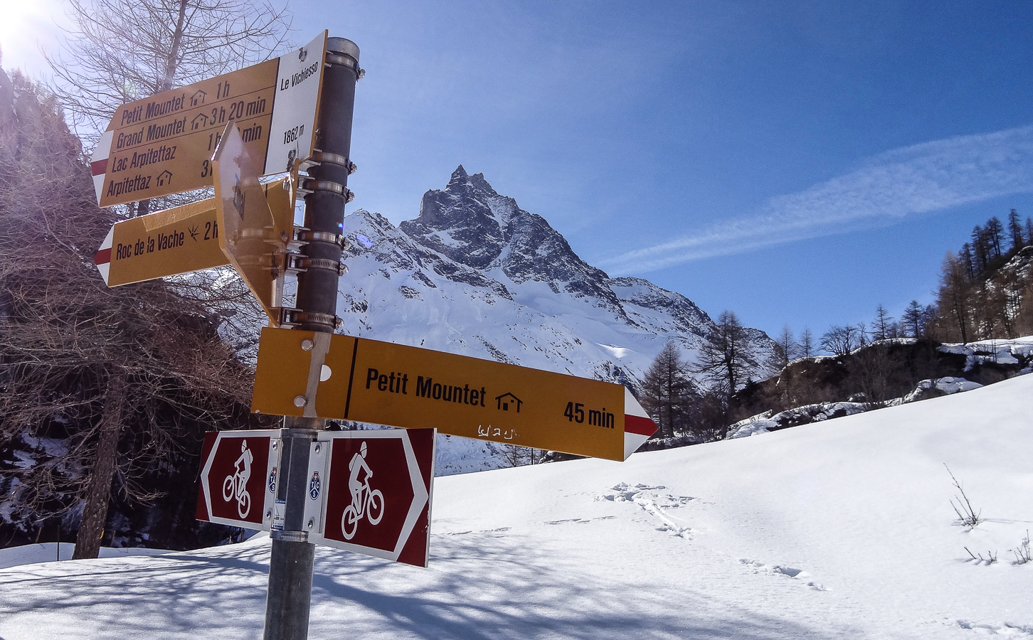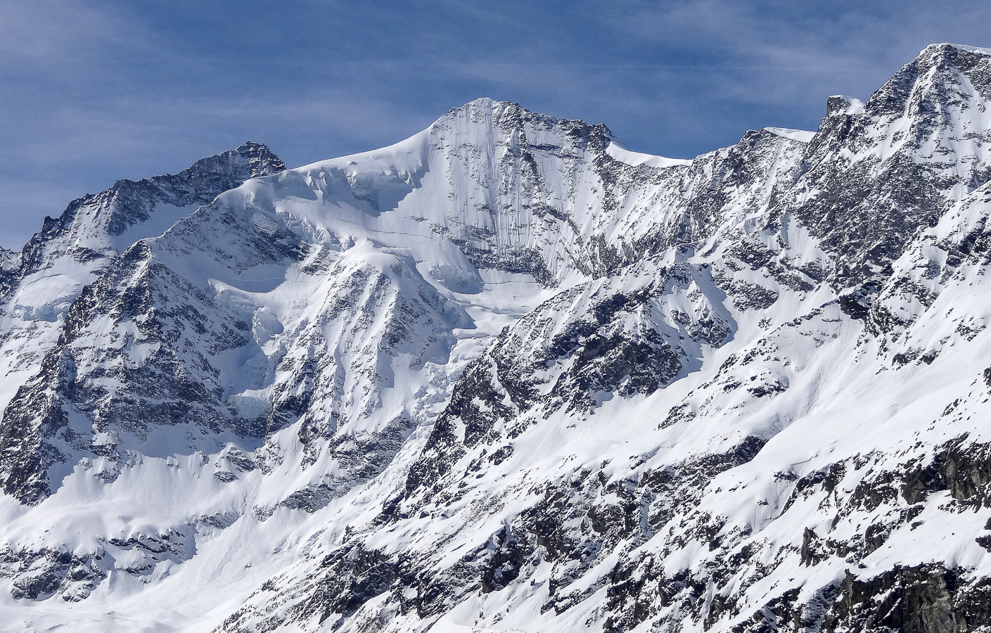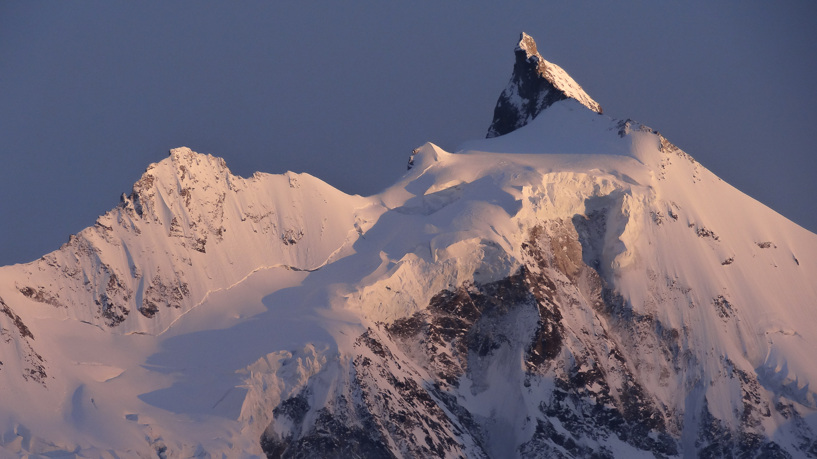 La photographie ci-dessous ne nous montre pas le Bishorn. Mais le Weisshorn, que nous aurions dû admirer si le temps nous avait été favorable. Mais que diable ! La montée seule au refuge de Tracuit nous apporte son lot habituel de satisfactions . La marche est longue, éprouvante lorsqu’il fait très chaud et qu’il faut remonter les grandes pentes en plein sud. Le spectacle de fin du jour est toujours aussi somptueux avec une partie des grands sommets de la couronne de Zinal . Zinalrothorn, Blanc de Moming, Dent Blanche et Grand Cornier.