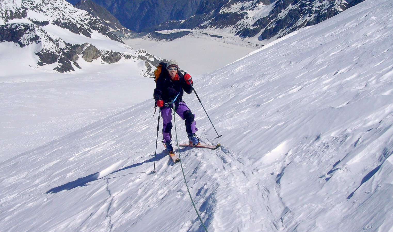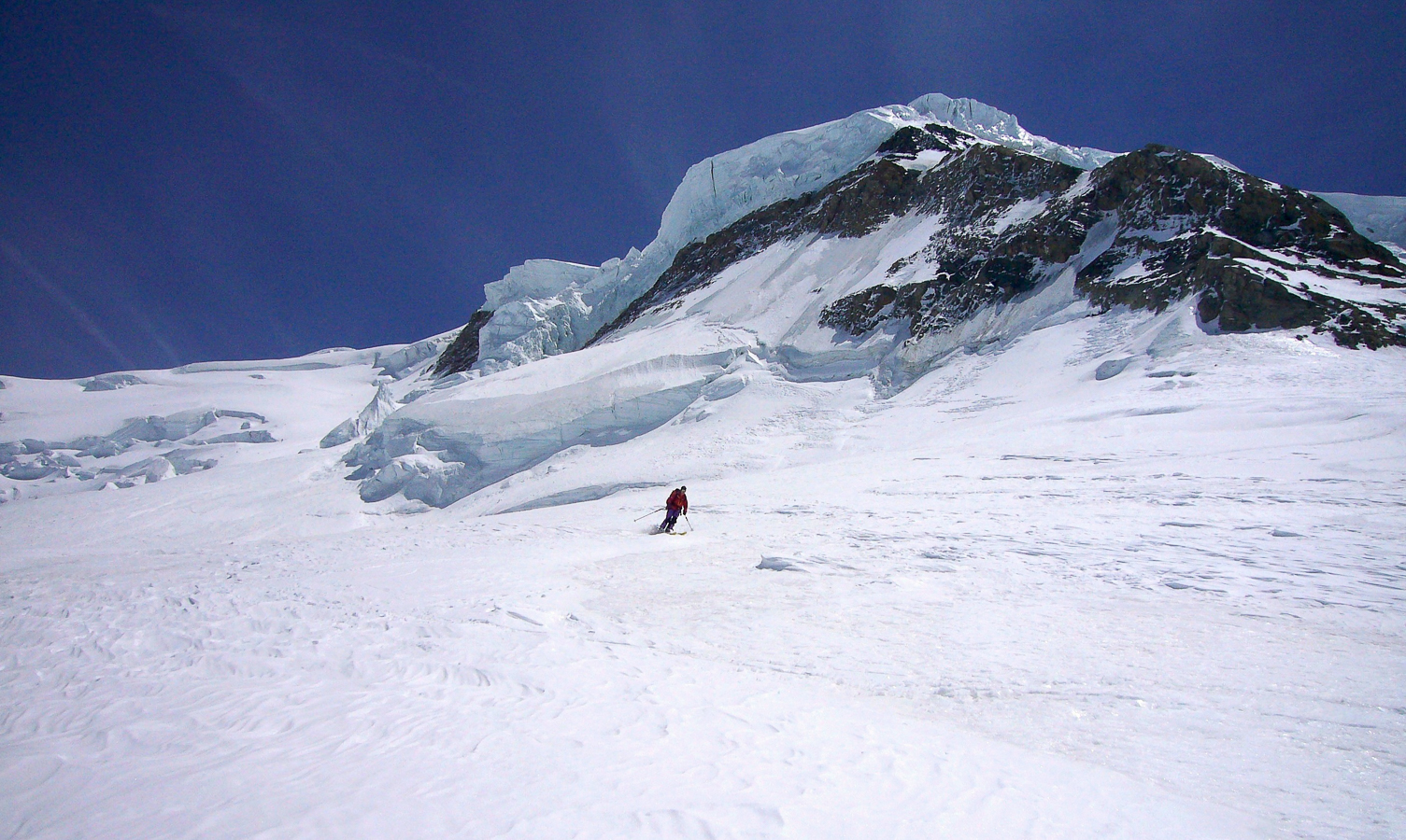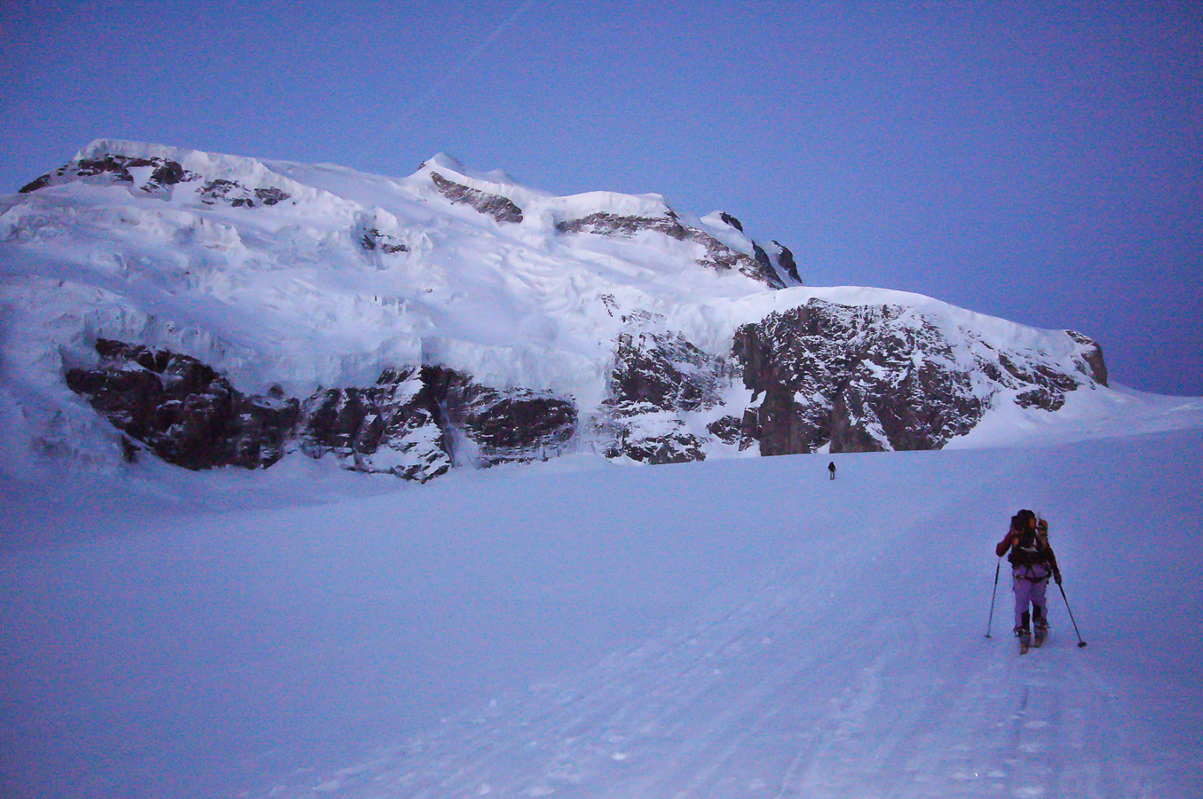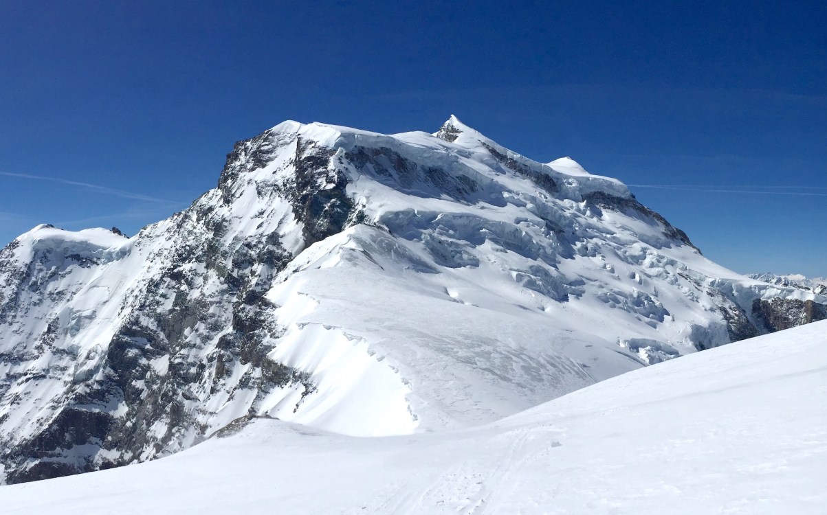 Si vous partez de Fionnay, en Suisse valaisanne, et que vous empruntez le chemin escarpé qui donne accès au refuge de Pannossière, vous allez déboucher sur un des secteurs les plus imposants des Alpes, barré au fond par la masse gigantesque du Grand Combin. Cette course représente un objectif incontournable pour tout skieur-alpinisme qui veut un jour poser son sac sans regret. Cette montagne, on la voit de très loin, elle nous a tenté depuis notre jeunesse et le gardien du refuge de Pannossière, qui surveille la montagne tous les jours aux jumelles, a fait savoir que c’était » tout bon « .