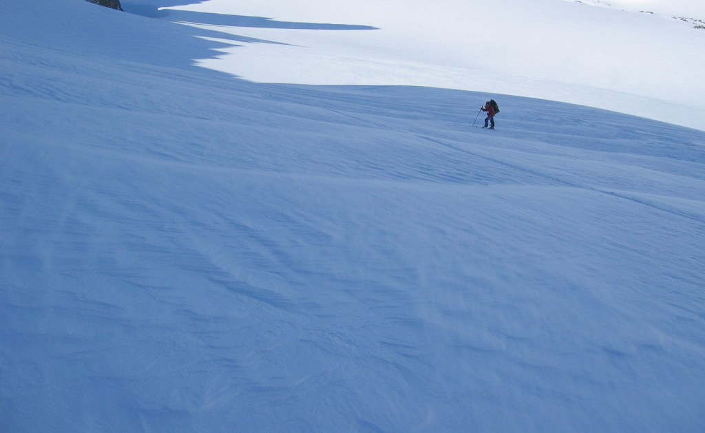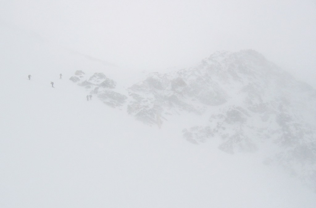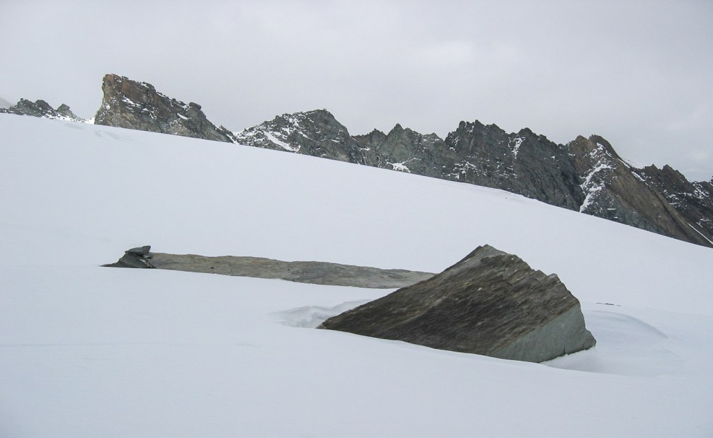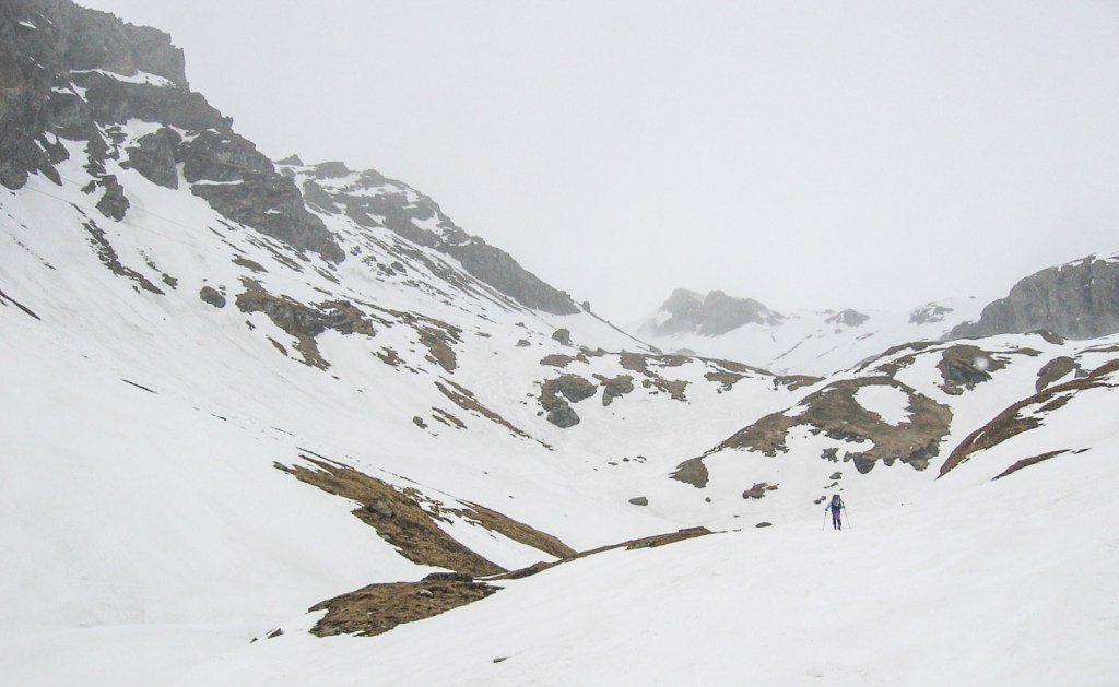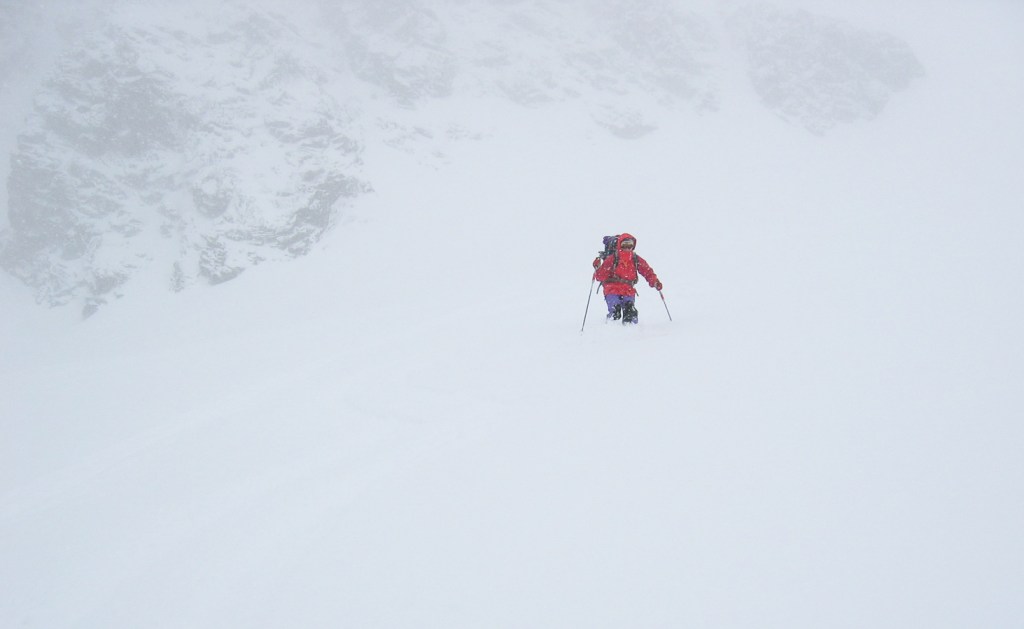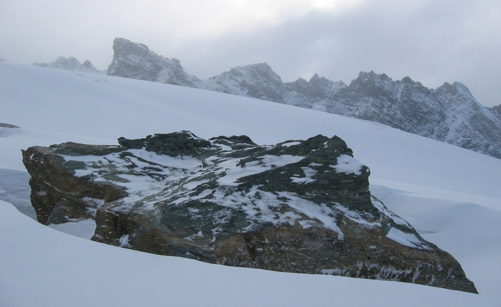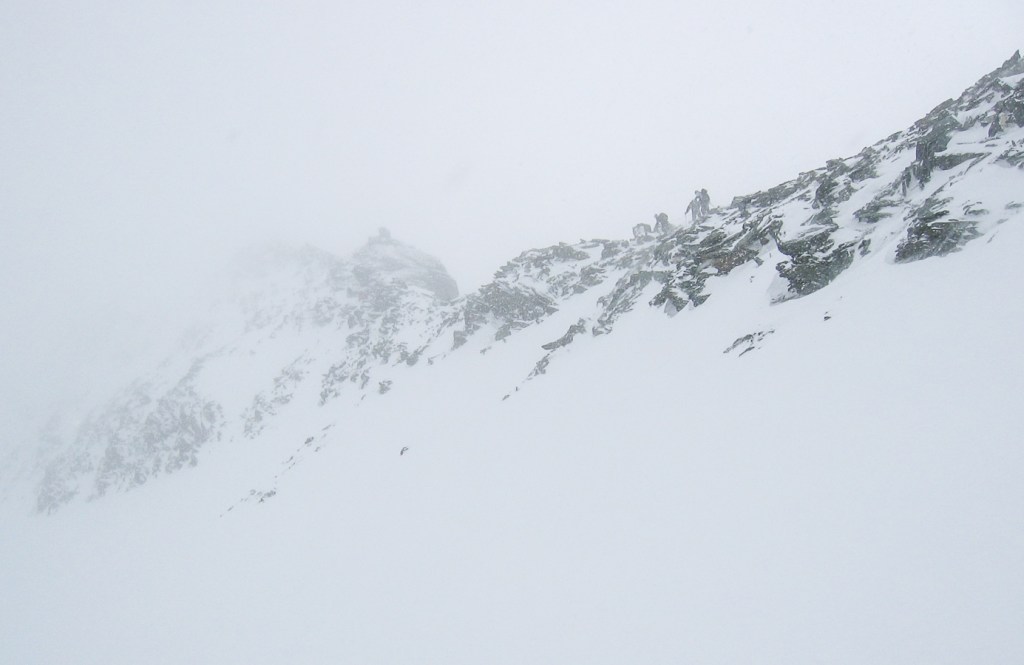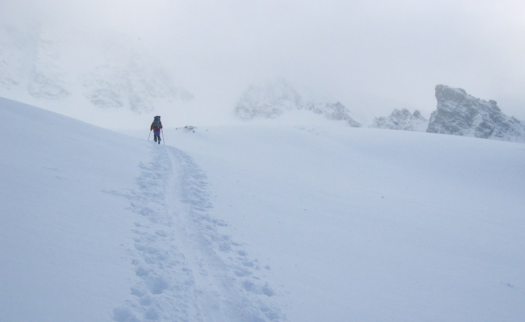 Les photos ci-dessous montrent la montée au refuge, une tentative dans le mauvais temps le dimanche, et l’ascension le lundi alors que la montagne a été désertée. On s’arrêtera au sommet d’hiver, pris par le temps incertain, à 28m de hauteur sous la croix, au débouché du célèbre couloir Palavicini. Descente dans le brouillard pour retrouver nos skis au bon point GPS.