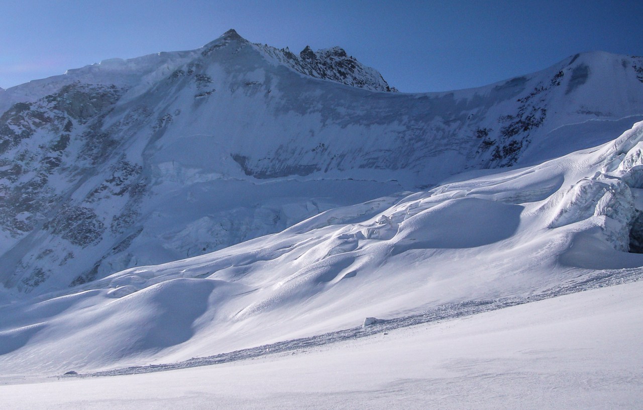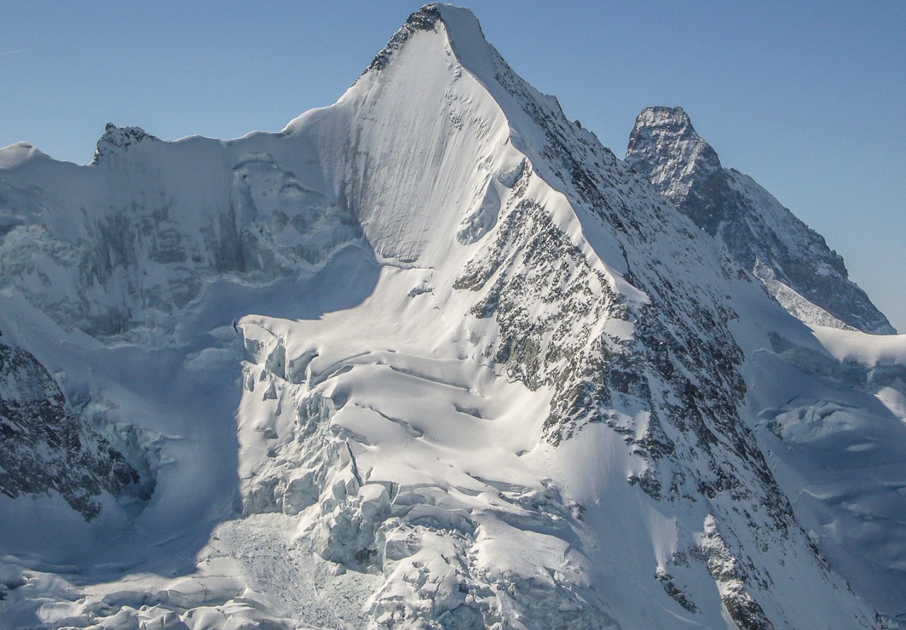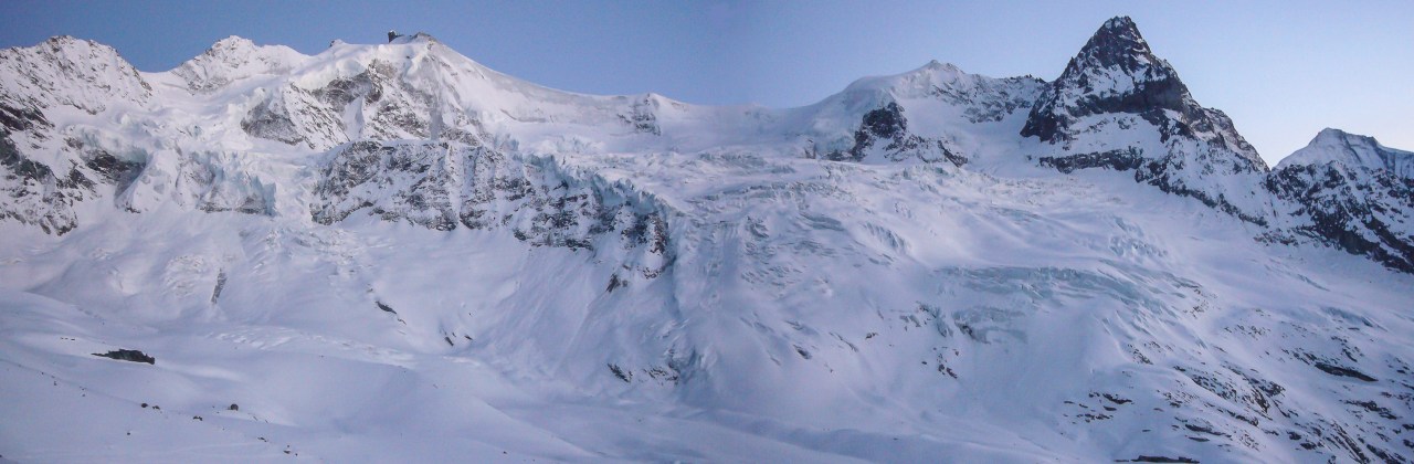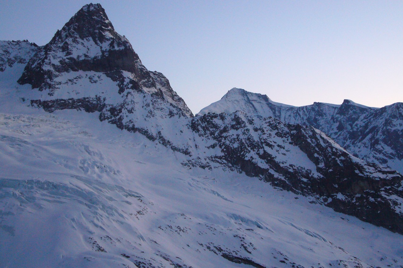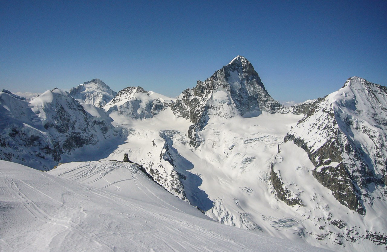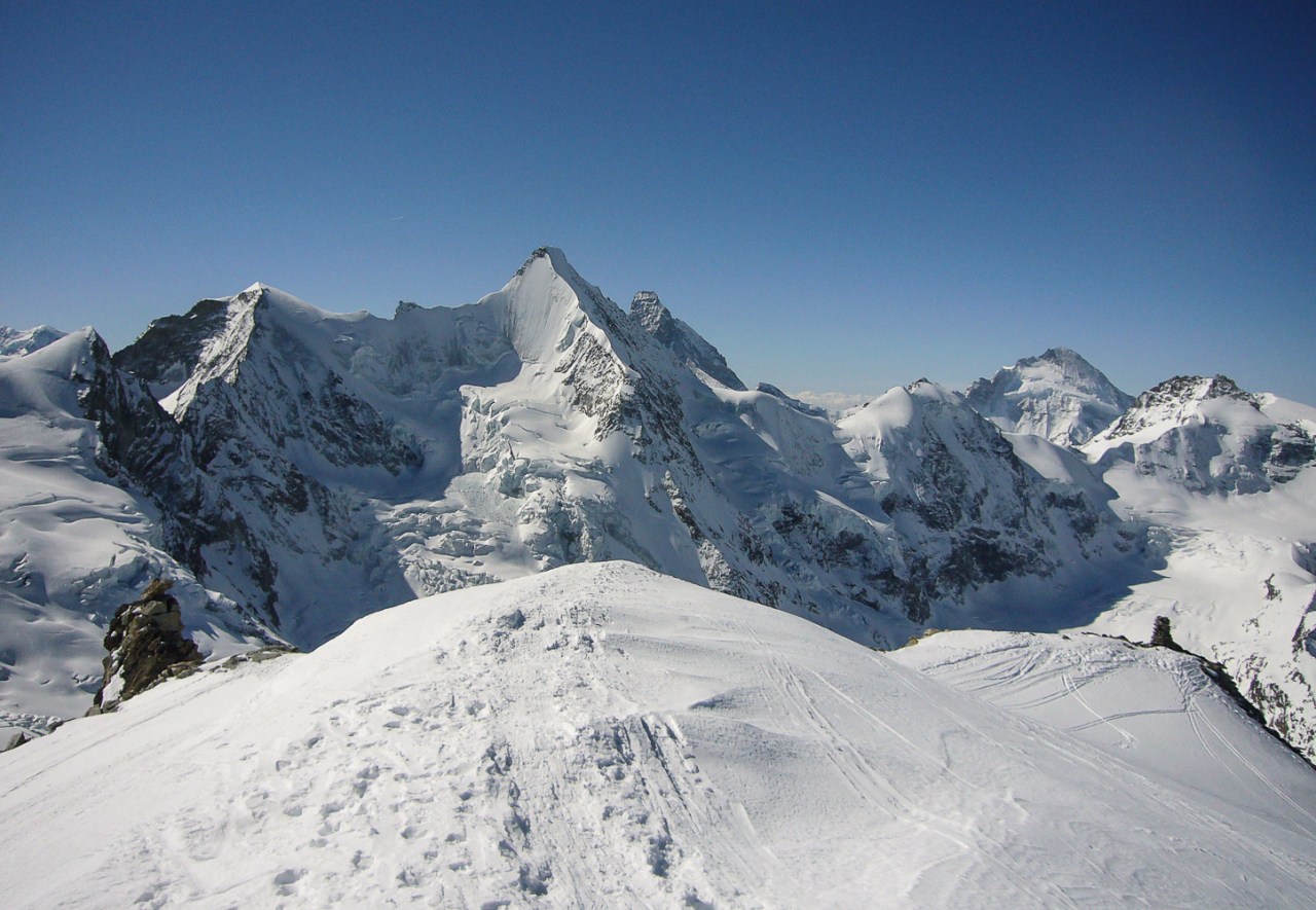 Cette course en montagne vaut surtout pour le spectacle extraordinaire des hauts sommets qu’elle nous offre. De gauche vers la droite: Weisshorn 4506m, Schalihorn 3974m, Zinalrothorn 4222m, pointe de Mountet 3876m, Trifthorn 3728m, Obergabelhorn 4064m, le Mont Durand 3609m, la pointe de Zinal 3790m, la Dent Blanche 4358m, le Grand Cornier 3962m.