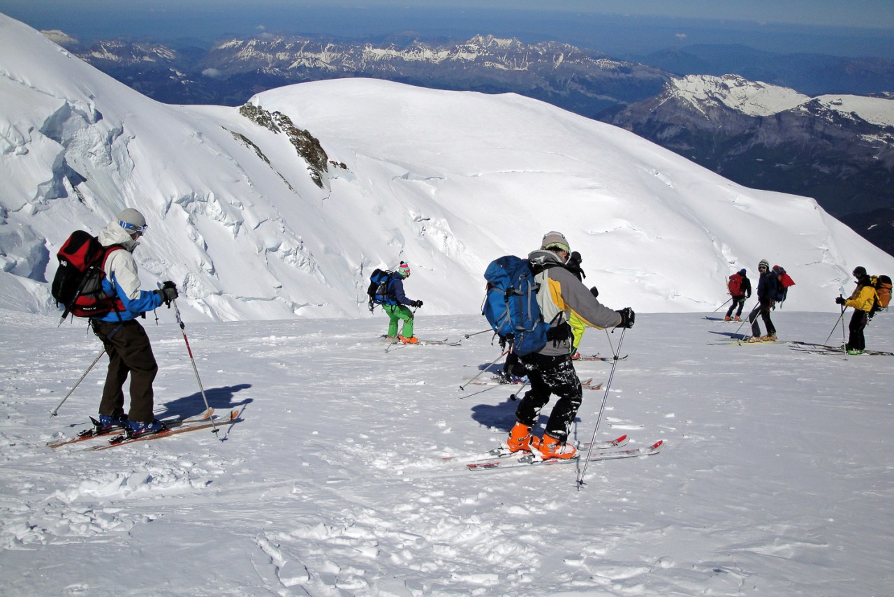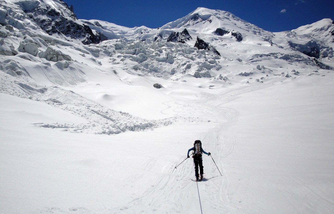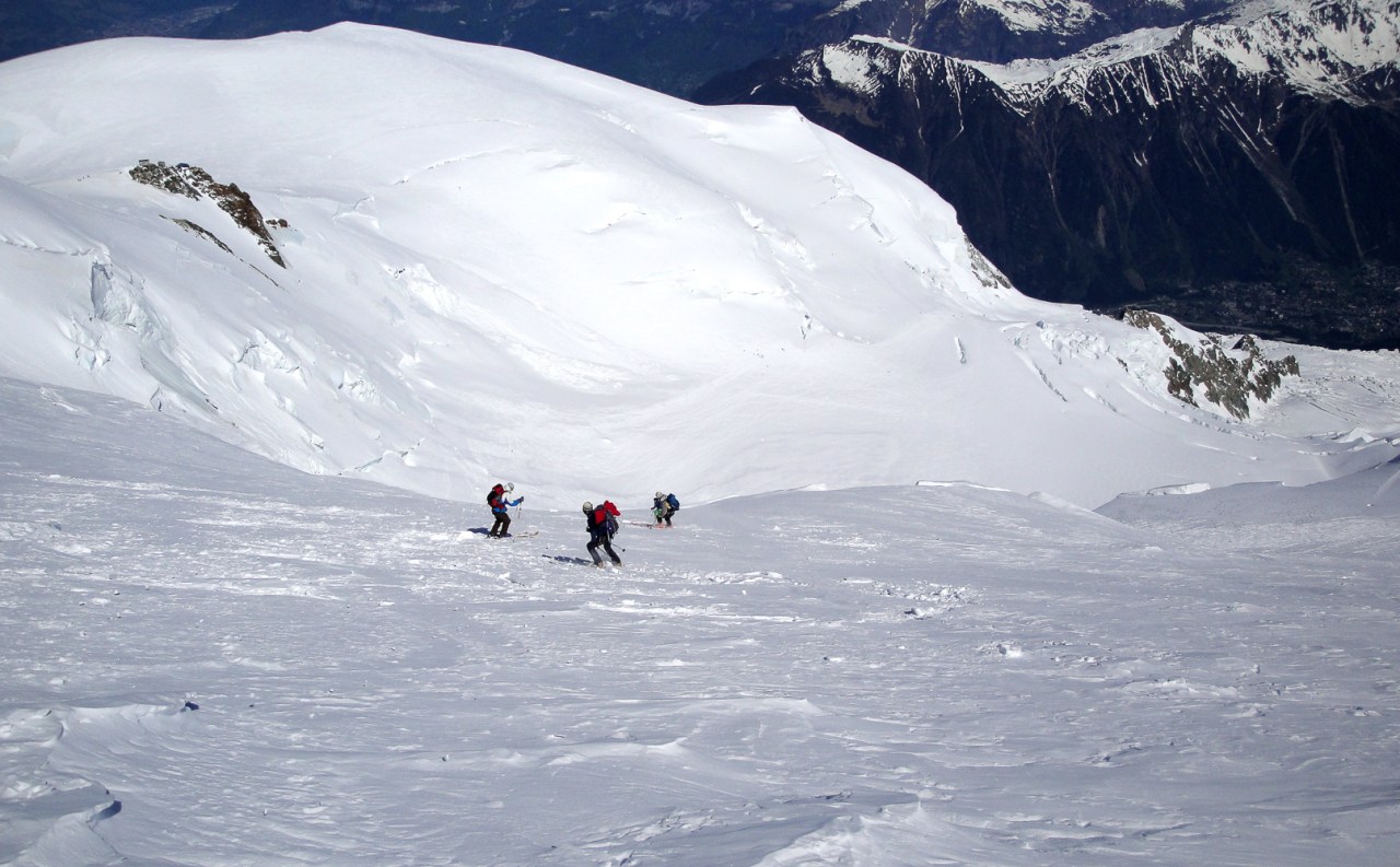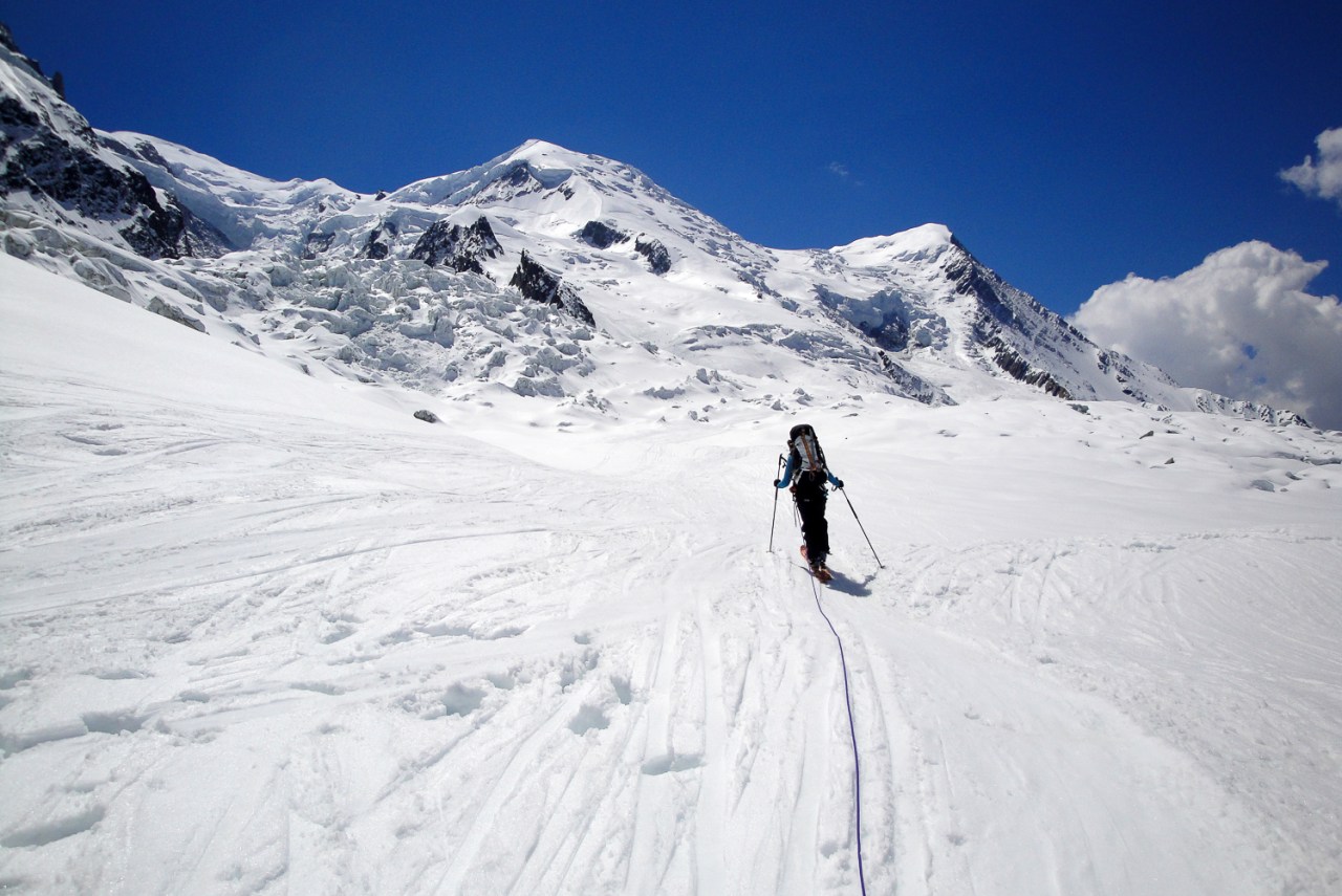 L’ascension à skis du Mont-Blanc est également un bel objectif pour tout amateur de grands espaces, d’efforts soutenus dans l’obscurité et le froid mordant de l’altitude. La montée encordée au refuge des Grands Mulets n’est pas sans dangers: avalanche dans la longue traversée sous l’Aiguille du Midi, crevasses à la jonction des glaciers des Bossons et Taconnaz. La météo dicte sa loi. Un nuage lenticulaire qui peut paraître anodin depuis Chamonix, génère près du sommet des conditions hivernales, froid, brouillard, neige, vent, qui désorientent bon nombre de cordées.