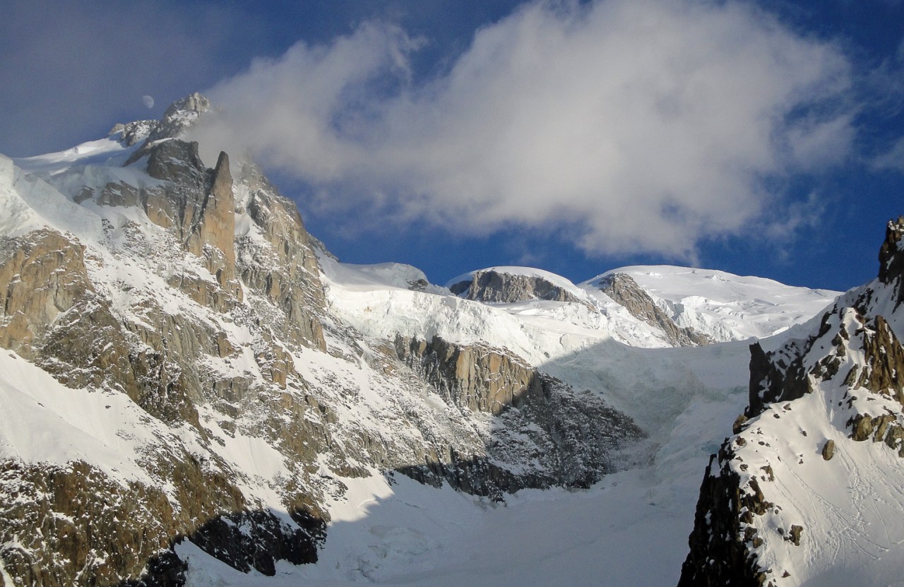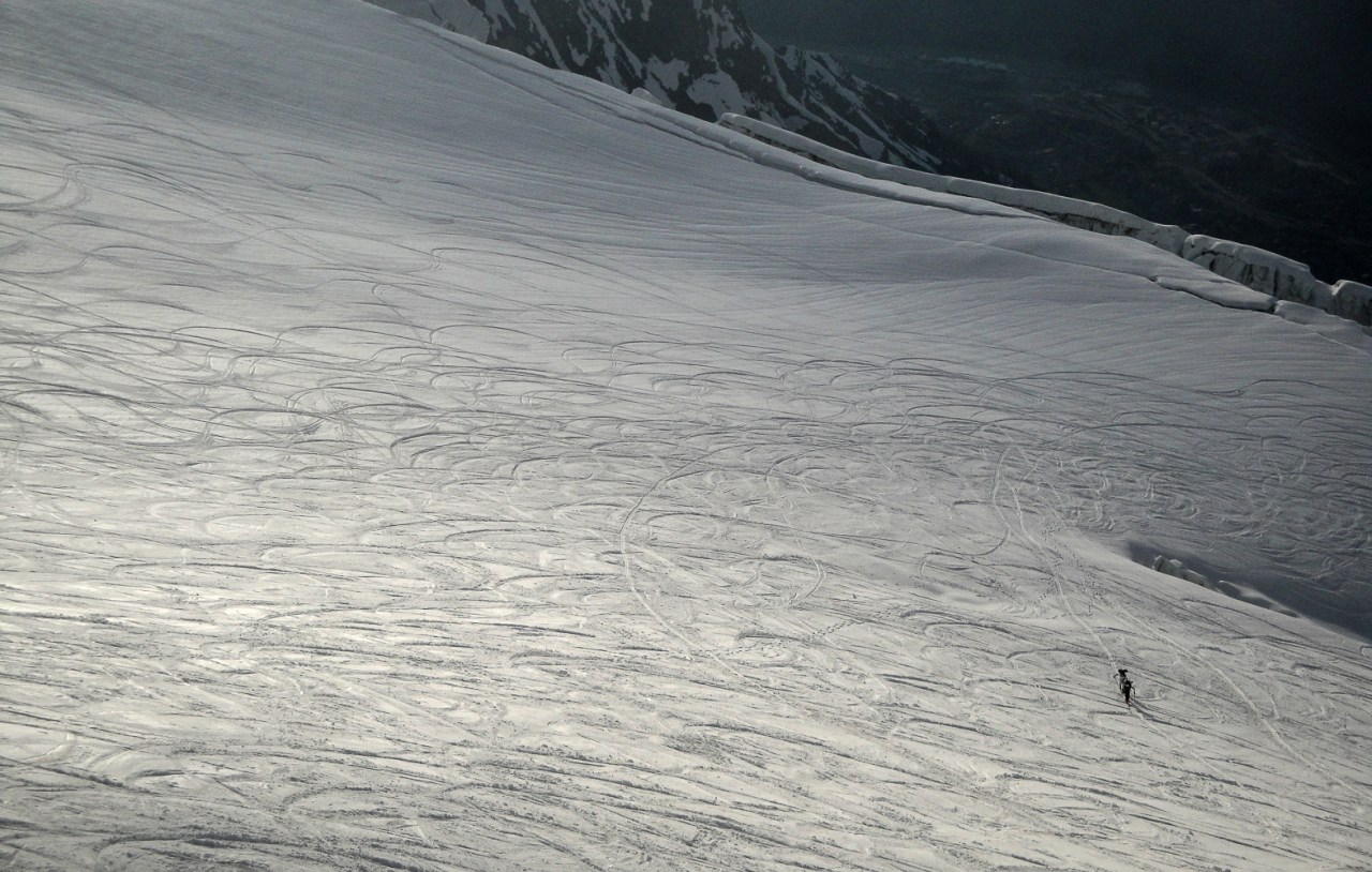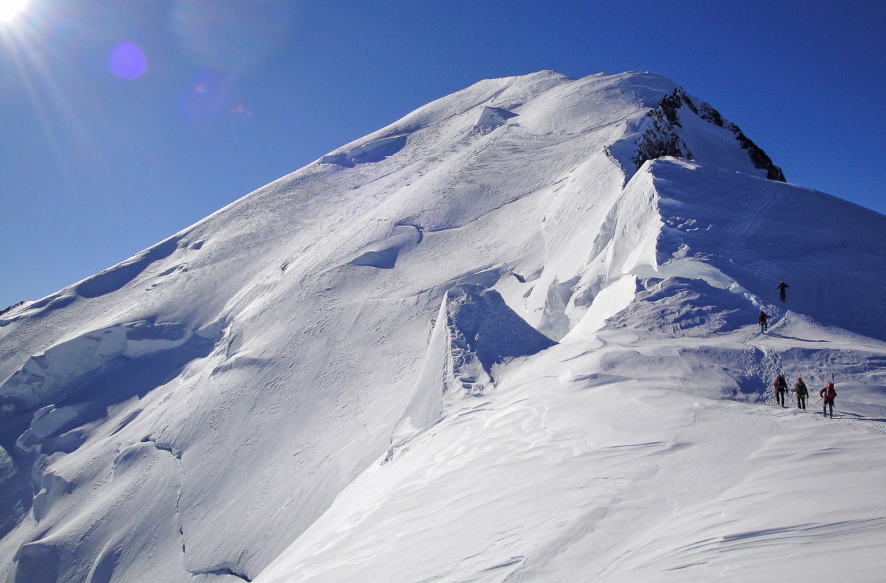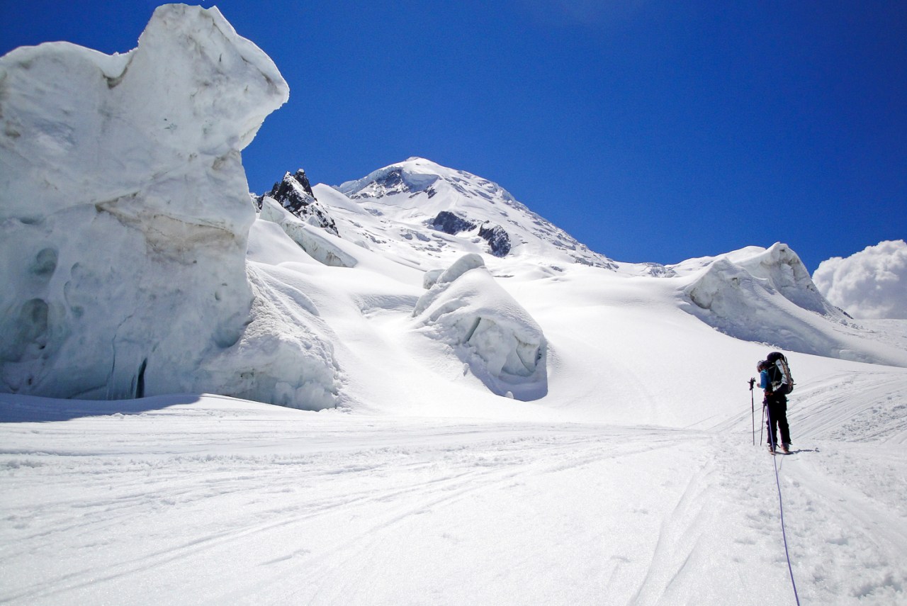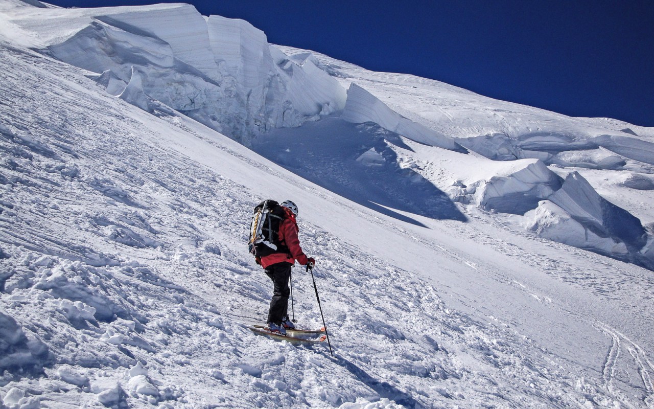 L’ascension à skis du Mont-Blanc est également un bel objectif pour tout amateur de grands espaces, d’efforts soutenus dans l’obscurité et le froid mordant de l’altitude. La montée encordée au refuge des Grands Mulets n’est pas sans dangers: avalanche dans la longue traversée sous l’Aiguille du Midi, crevasses à la jonction des glaciers des Bossons et Taconnaz. La météo dicte sa loi. Un nuage lenticulaire qui peut paraître anodin depuis Chamonix, génère près du sommet des conditions hivernales, froid, brouillard, neige, vent, qui désorientent bon nombre de cordées.
