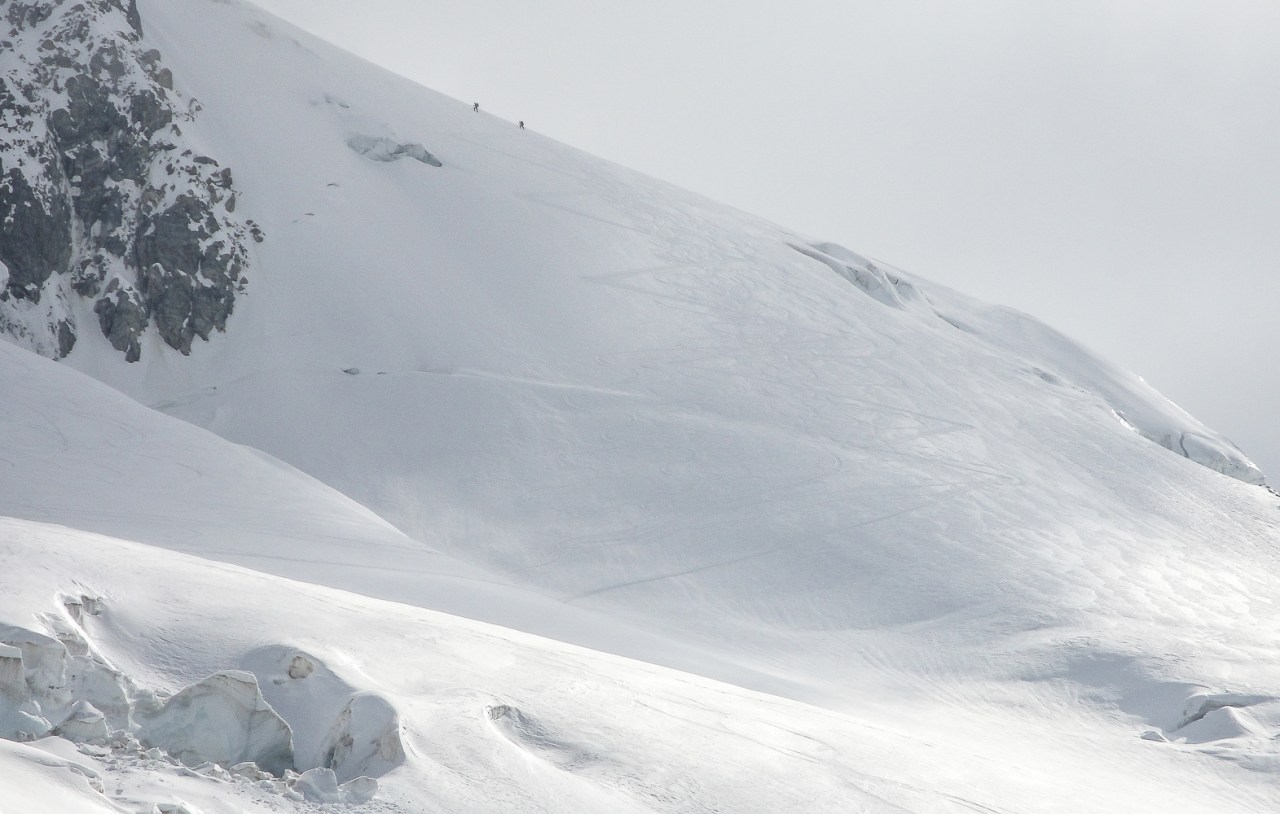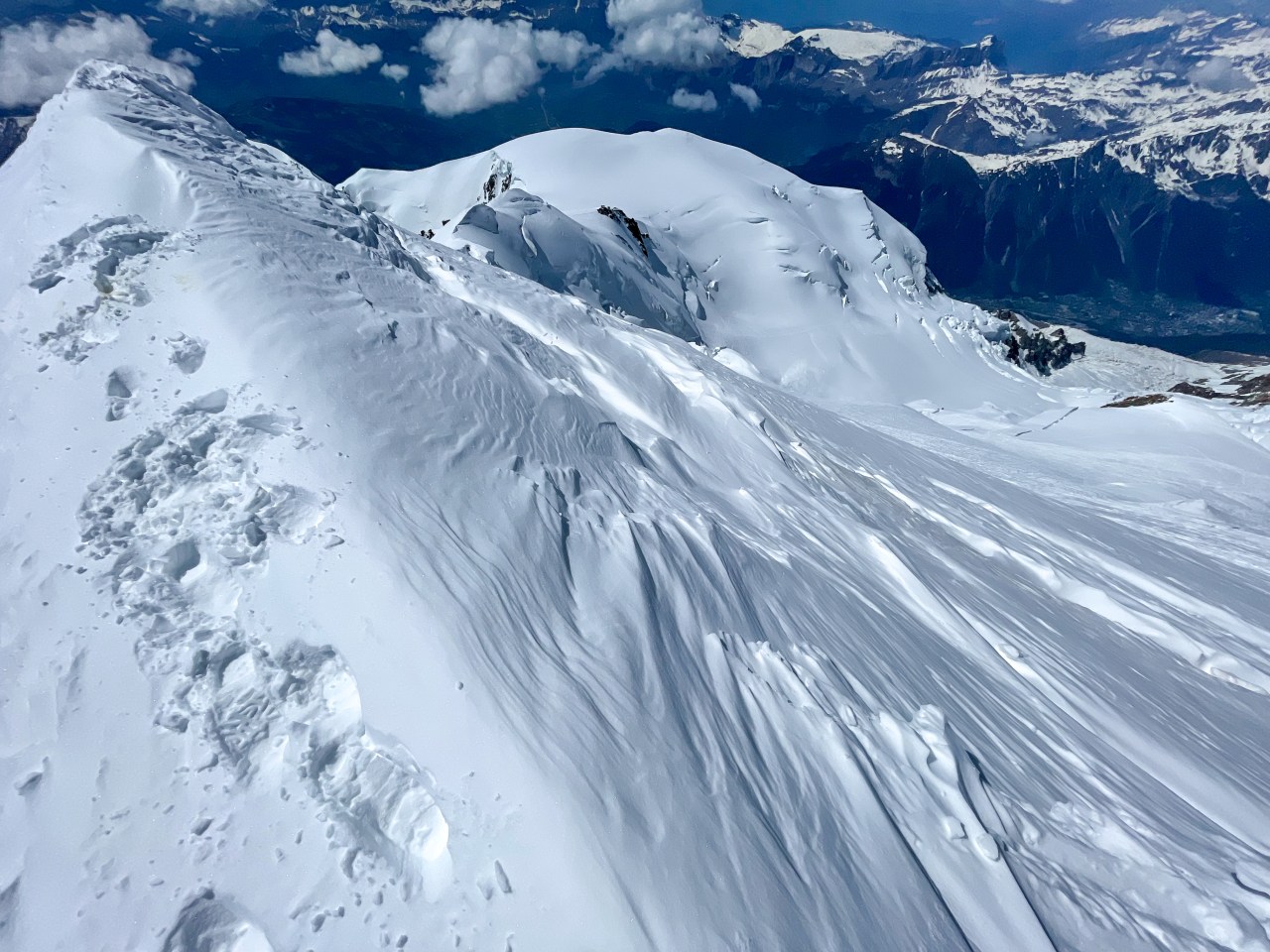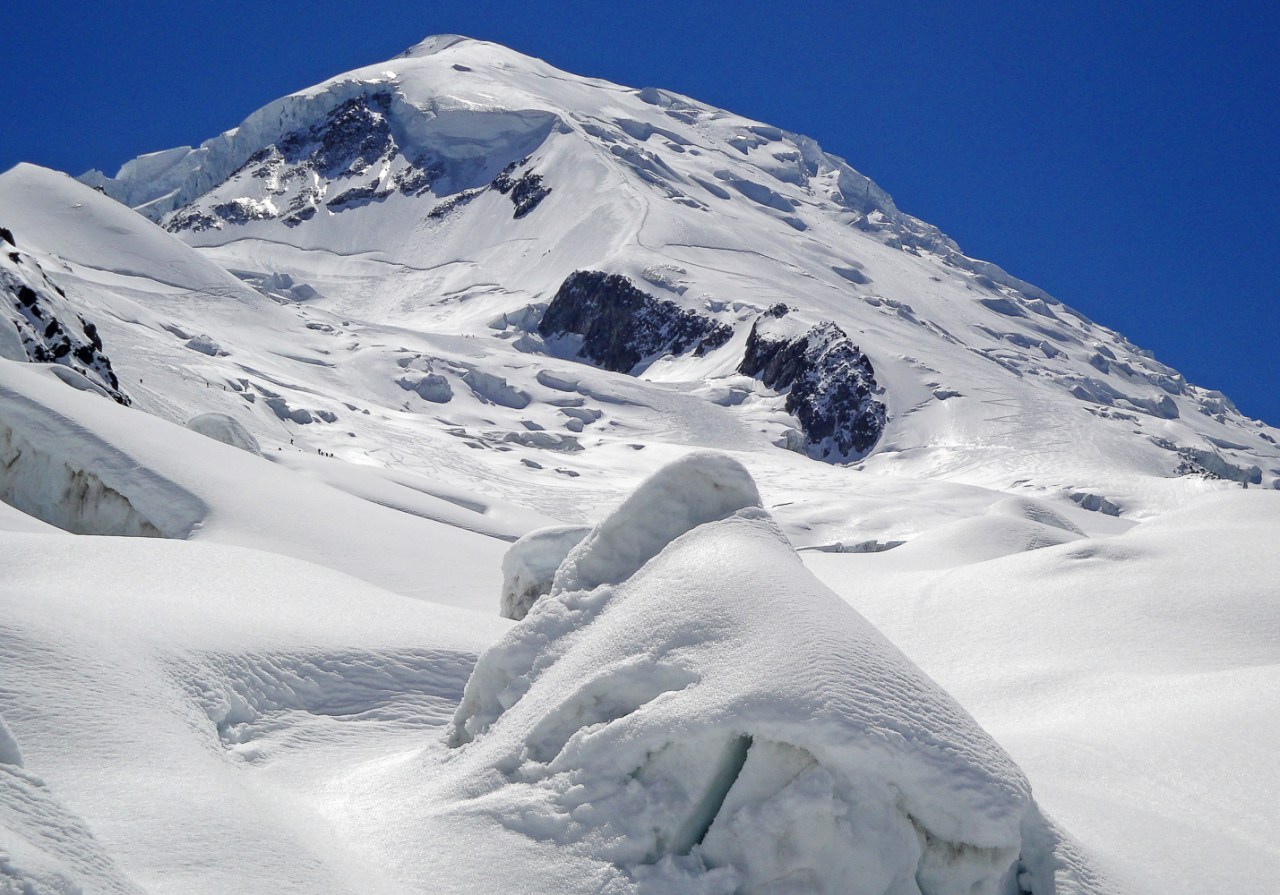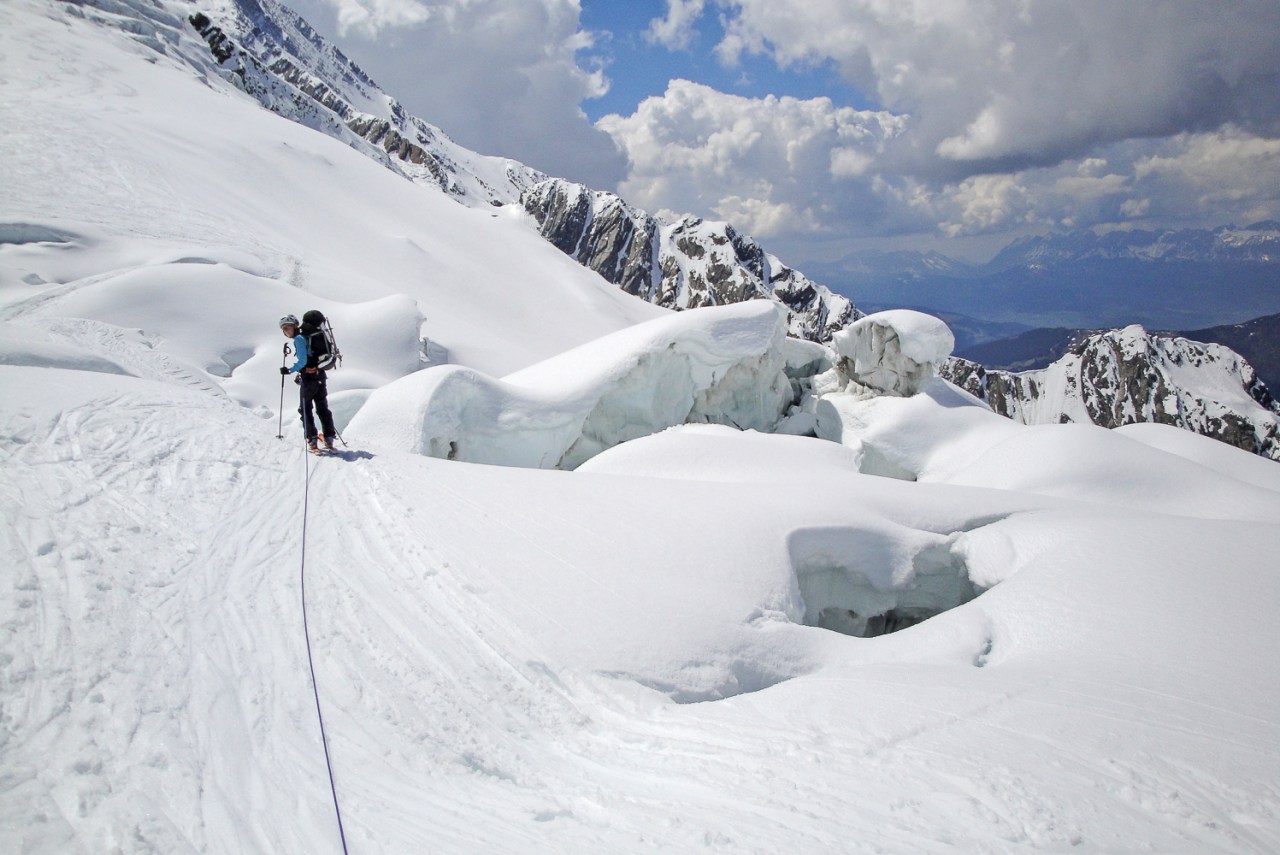 L’ascension à skis du Mont-Blanc est également un bel objectif pour tout amateur de grands espaces, d’efforts soutenus dans l’obscurité et le froid mordant de l’altitude. La montée encordée au refuge des Grands Mulets n’est pas sans dangers: avalanche dans la longue traversée sous l’Aiguille du Midi, crevasses à la jonction des glaciers des Bossons et Taconnaz. La météo dicte sa loi. Un nuage lenticulaire qui peut paraître anodin depuis Chamonix, génère près du sommet des conditions hivernales, froid, brouillard, neige, vent, qui désorientent bon nombre de cordées.
