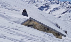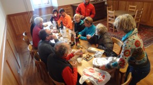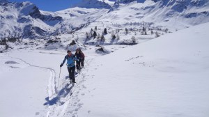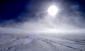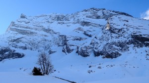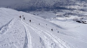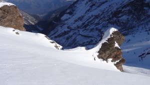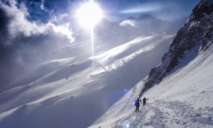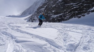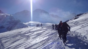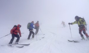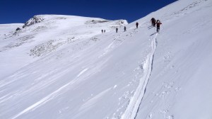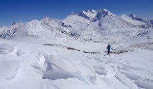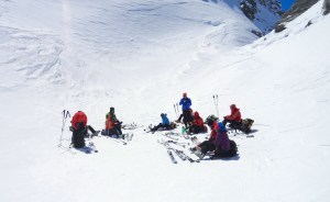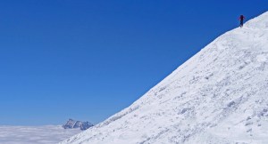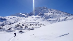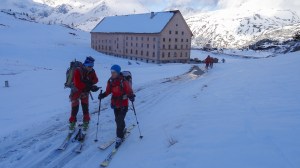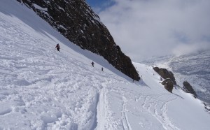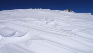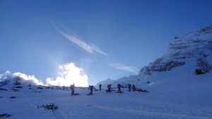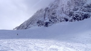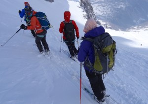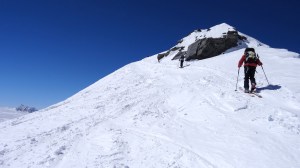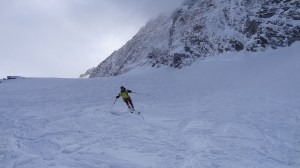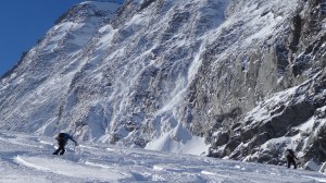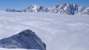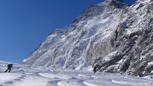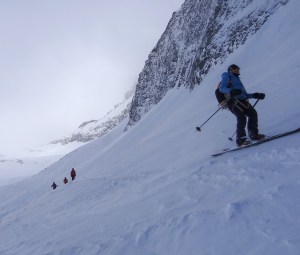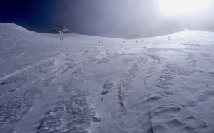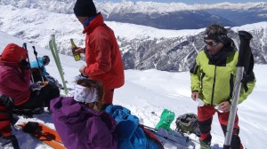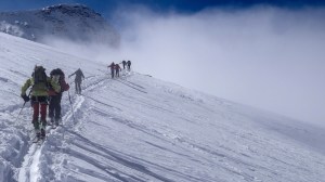 Arrivés à 10h samedi au col du Simplon, sous une avalanche de ciel bleu, mais par un risque 3 (marqué) nous avons préféré d’abord grimper un sommet tranquille – le Spitzhorli 2726m – pour observer le terrain, et de loin, ceux qui sont tout de même partis faire la trace. Le lendemain, des conditions exceptionnelles sont permettaient d’effectuer une grimpette sans problème, et une descente de rêve en poudreuse, agrémentée d’un brouillard épais qui nous permit de tester notre flair à retrouver des traces incertaines.